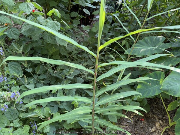 Hardy Ginger (Hedychium) are typically grown for their late summer flowers and vertical wide-leaf foliage. The plants are large tropical and subtropical herbaceous perennials with a rhizomatous rootstock native to areas with a summer monsoon and dry winter. They can be grown as flowering summer patio plants. If growing as a potted plant and trying to overwinter, allowing the foliage to frost is ok, it will not kill the root system. However, do not allow the pot with rootball to freeze solid or go below 20 degrees for more than a few hours; move into a cold garage or basement over the winter with no watering. Cut back and allow to go dormant and place entire pot back out in April or May with a time-release fertilizer. Another more labor intensive way to overwinter cannas is to remove them from the dirt, dust with fungicide, place in box with sawdust, and keep in the refrigerator. We consider this method old-fashioned and too much work but ok if you only want to save a few pieces. If digging from the ground, just save a big chunk with the dirt intact and place into a large pot in the garage. During the growing season, fertilize, water regularly, and place in full sun. You may also plant these in the ground for an enormous tropical effect! It is possible to overwinter these in the ground in Kansas by mulching 6-12" thick over deeply planted rhizomes. New growth may be slightly delayed but probably quick to regain full height. Native habitat for most hedychiums aligns well with our dry winters and warm humid summers. In our trial gardens in Lawrence, KS (zone 6a), we will be testing several varieties in 2022-2023. Famous plantsman, Tony Avent, owner of Plant Delights Nursery in Raleigh, North Carolina, advised us that hedychiums should survive fine here in the ground when mulched like cannas. Hedychium coccineum features orange flowers.