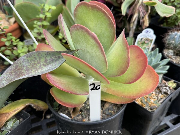 The foliage color, texture and patterns make Paddle Plant (Kalanchoe luciae) an excellent architectural specimen. Usually used as a patio or house plant in Kansas, they can also be grown as an annual. Grow in full sun to part sun with optional extra watering including that which comes from rainfall. Plants with time to acclimate will thrive in full sun but be careful not to rush it or sunburning will occur. Generally if moving outside for the summer, allow 2-3 weeks of part shade or morning sun before placing in full sun. Repotting may or may not be needed depending on how large you want the plant to grow; plants can continue to grow and tolerate extremely root-bound pots. Protect from temperatures below 35 degrees F and move into a bright window over the winter with no watering. Do not allow Paddle plant grown in pots to freeze solid or get close to freezing especially if soil is wet or death may occur. As a winter house plant, it will look presentable all winter long with just a few monthly or no waterings if you forget. As a permanent house plant, provide bright light and allow the soil to dry between waterings for many years of carefree enjoyment. Potted plants are very low maintenance needing only old leaves trimmed once per year. This is not at all a big-box store plant so be prepared to expand your plant palette with Paddle plant!