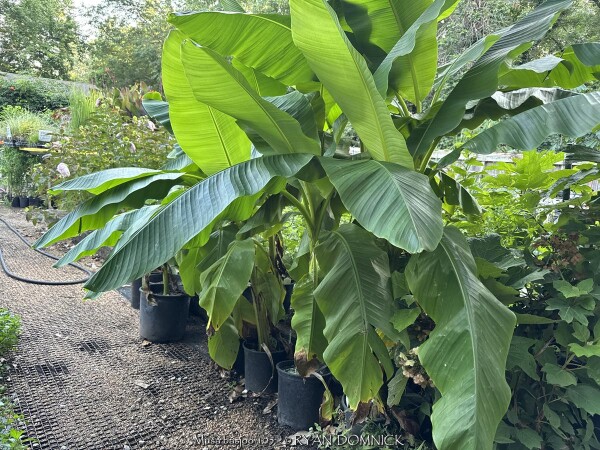 Create a tropical effect in your landscape with these large fast-growing cold hardy Musa basjoo! (also called Japanese fiber banana) Each leaf can be 6 feet long and 2 feet wide. Leave in ground and mulch 6" thick and they will return as perennials every year. If planting on the south side of a house in full sun, little protection is needed. These have proven hardy in Lawrence, KS (zone 6a) for over 20 years. In Eastern Kansas, typically our 40 inches of rainfall is sufficient without extra water in good soils. This species will tolerate some degree of drought but fastest growth will occur in rich well-drained soils with extra water and fertilizer provided during the summer. Great for summer wet areas in full sun or around swimming pools (creates no messes). Plants are capable of growing 15-18 feet by the end of summer when established and happy! A more realistic height is 7-12 feet under average conditions. Banana trees will slowly divide and send up offsets; this is a desirable sign that the banana tree is establishing well. If 1-2 feet of trunk is protected with a large pile of leaf mulch, you will get a flower followed by small inedible bananas the 2nd year on the largest trunk. The flowering trunk will die but the offsets will grow. Bananas will not tolerate excessively wet soils during dormancy. Sunburning can happen with summer temperatures over 100 degrees F but it will quickly outgrow the damage. Bananas need at least 1/2 day of full sun and protection from excessive winds to properly grow. Listed by many sources as hardy to zone 6 or 7, with proper mulching and placement near a foundation, you can easily grow this into zone 5 or possibly lower. In our trial gardens in Lawrence, KS (zone 6a), two well established specimens have thrived for 15 years and counting. During the arctic blast of February, 2021, lows down to -17 degrees F on Feb 16th, 2021 were recorded. The longevity of this cold blast was also impressive: 10 days on a row with highs of 10-15 degrees F or lower, 8 nights of lows in the single digits and negatives, and 36 straight hours of 0 degrees F and mostly lower. A hard ground freeze was inevitable; hundreds of plants around town survived this event returning a little late the following spring but otherwise just fine. Some were mulched with ground up leaf mulch, some were not.
