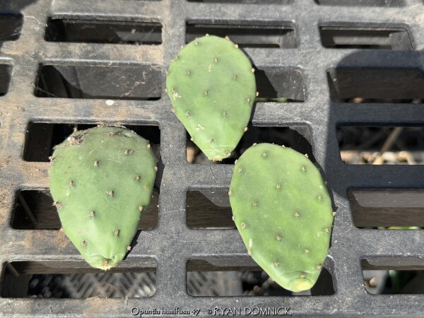 Eastern Prickly Pear Cacti (Opuntia humifusa) have attractive green pads, brilliant yellow flowers in June, and pinkish maroon edible fruits afterward that last into winter. They are native to eastern woods of Kansas, Missouri, Oklahoma, Texas, Arkansas and much of the Southeast United States. This cold hardy succulent occupies an unusual niche: growing in poor shallow sandstone based soils in open woods and on sunny rock cliffs that dry out too quickly for most other plants to colonize. Pads are sometimes carried off by animals and take root elsewhere. Grow this small native gem in rock gardens, dry shade areas, in parking lot medians, in cracks between rocks, or on top of or in a retaining wall. This species will grow in full sun or full shade! Although not picky about soils, just ensure that drainage is good. If grown in exterior pots and kept on the dry side, you may leave out all winter allowing to freeze solid; plants will go completely dormant and resume growth in the spring. Although these prickly pear do not have spines, they do have glochids. (painful bristles that come off and irritate the skin for a few days) Great low maintenance cold hardy and very versatile succulent.