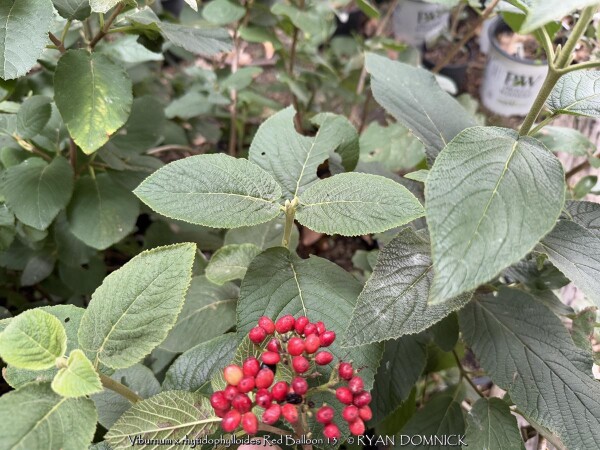 Leatherleaf viburnum is a large semi-evergreen shrub with leathery leaves and cream white flowers. Foliage emerges light green with powdery white material on the backside of the leaf. Foliage darkens to a medium green by summer and finally turning to a purplish winter color. About half of the foliage drops in the winter but is still effective enough for a partial screening. Flowers bloom mostly in spring but sporadically throughout the year. If pollination occurs, red fruits follow in the late summer thru fall creating quite a show. More than one variety is typically required for pollination. Leatherleaf viburnum prefers medium to rich garden soil in full to part sun. Being one of the toughest viburnums around, it can handle much less than ideal conditions including dry shade. Typically our are 40 inches of rainfall per year in eastern Kansas is enough without extra water. However, during times of drought, the foliage will wilt and growth will stop. Luckily the foliage is able to survive in a wilted state for a long time (usually up to two or three weeks) before actually dying. This gives you plenty of notice that it needs water. There is virtually no maintenance except rejuvenation on very old plants. Yearly fertilizer application is appreciated. When given plenty of room to grow, Leatherleaf Viburnum can reach up to 8 or 12 feet tall and wide after 20-30 years. Eventually old canes become unproductive and should be removed allowing young vigorous canes to develop. Leatherleaf viburnum grows slow at first especially in rough soils but the key thing is that it will survive and grow faster when established. Cold hardiness is not a problem in Lawrence Kansas zone 6a but in colder climates expect winterkill down to the ground in some years. Considered one of the best plants for solving your most difficult dry-shade landscape challenges. Several improved cultivars exist. Red Balloon Leatherleaf Viburnum (Viburnum x rhytidophylloides 'Red Balloon') features significant improvements. In spring, large, lacy white flower clusters cover the plant, followed by green fruit which turns brilliant red in late summer. The thick, leathery foliage lends a distinguished, handsome look to the plant all season. This viburnum will develop some berries without another variety as a pollinator, but you'll get more fruit if planted around 'Mohican' or 'Alleghany.' Proven Winners® plants are legally propagated, healthy and vigorous, true to name, and tagged with color pictures and growing information.