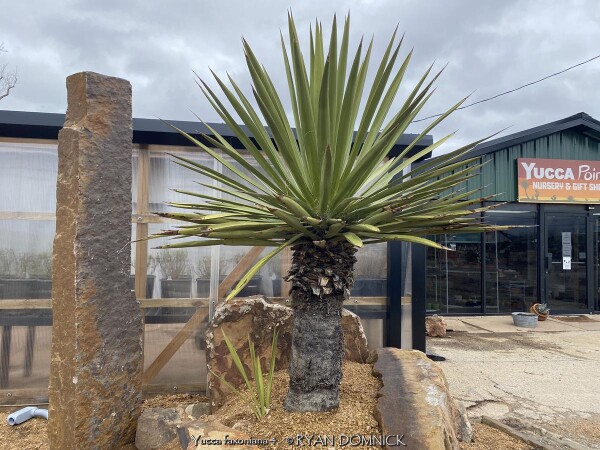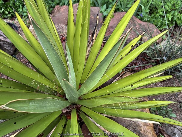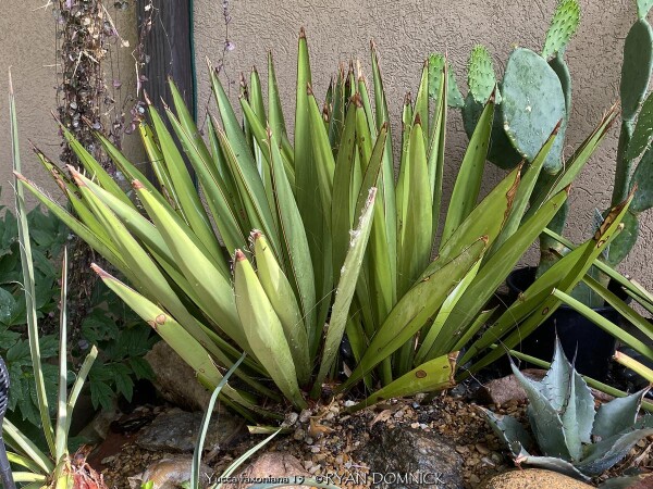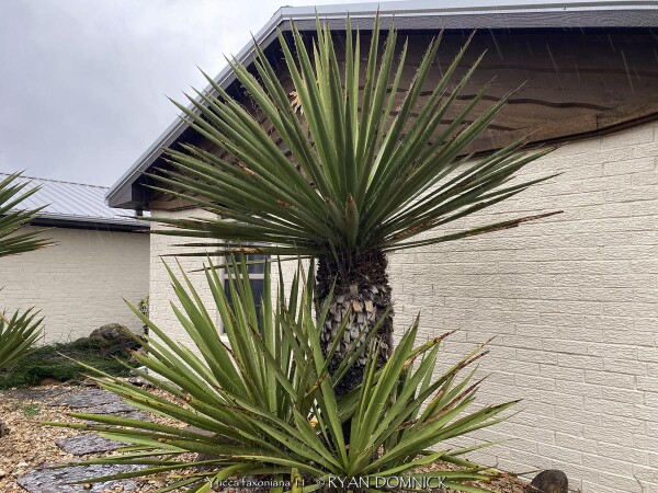 Bright green sword-like leaves from this yucca (Yucca faxoniana) make an excellent architectural statement. Used as a patio plant in Kansas, place in full sun with no extra watering except from rainfall. Repotting may or may not be needed depending on how large you want the plant to grow. Potted plants are hardy to at least 10 degrees F if kept dry so you can wait awhile to move these in for the winter. Then move into a cold garage, basement, or bright window over the winter with NO watering. Many yuccas, including this one, may also be grown from rhizomes, stem cuttings, or by digging offsets from the side of established plants. Having desert heritage, it resents poor drainage and winter moisture. To counteract that in Kansas, plant in full sun on berm with poor sandy or rocky soil with no irrigation. ADDITIONAL INFORMATION ABOUT CREVICE GARDENING: In nature, some of the most interesting xeric plants grow in tough places such as inhospitable rock outcroppings with almost no soil. We can recreate that specific and exclusive growing environment with a crevice garden. Crevice gardening allows you to grow cold-hardy cacti and succulents that are normally cold hardy to our climate (Lawrence, KS zone 6a) but not normally tolerant of excessive moisture (40"/year), especially in the winter. This technique provides optimal xeriscape growing conditions by limiting the amount of soil and water around the roots and reducing the potential of root rot. Start with a raised mound of fast draining soil mix consisting mostly of decomposed granite, coarse sand, gravel, and a small amount of organic matter. Incorporate vertical rock formations such as flagstone into a raised landscape bed creating narrow 1-2" wide crevices filled with the soil mix. This helps quickly channel rain and snow melt water down more deeply into the soil encouraging deeper root growth while keeping the soil dry around the base of the plant. It is important that the entire mound is well above grade level to avoid drainage problems; crevice gardens typically range from 12"-36" tall. After installing the plants, mulch with a thin layer of pea-gravel or decomposed granite. In our Lawrence Kansas zone 6a winters with occasional polar vortexes or arctic blasts, this technique works well in any hot microclimate such as a south facing side of a berm or under a south or west facing roof overhand of a house or building. Kansas Plant Farm LLC built a trial crevice garden in 2022 and we have now had enough time to evaluate the plants after a true winter cold spell. During the arctic blast of January 2024, low nighttime temperatures got down to -11 degrees F (Jan 10th,2024). The longevity of this cold blast was also impressive: 4 days on a row with single digit highs including 1 day with a daytime negative high(-2F), 4 nights of lows in negatives (-8For lower), and 48 straight hours of 0 degrees F and mostly lower. A light snow cover helped insulate the ground but wind blew off most powdery snow on the foliage exposing the top parts of the plants to some extreme temperatures with surprisingly little damage. In our crevice trial gardens in Lawrence, KS (zone 6a), this variety survived a harsh winter so far. Hardiness also confirmed at Denver Botanical Gardens (zone 5b) with several tree-like specimens in protected microclimates near concrete walls.