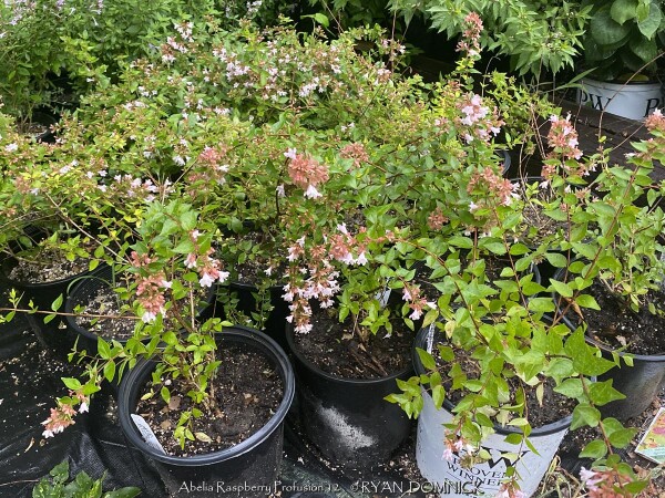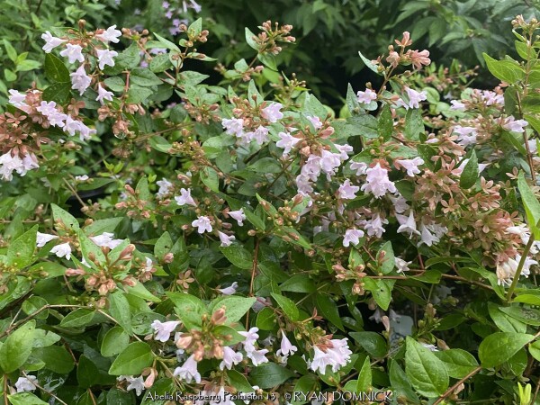 Raspberry Profusion Abelia (Abelia chinensis 'Raspberry Profusion') is a compact rounded, spreading, multi-stemmed shrub in the honeysuckle family. Typically grows on gracefully arching branches to 2-4' tall. 'Raspberry Profusion', a seedling selection of 'Edward Goucher' x chinensis, blooms heavily from May to September. The entire plant is covered with big clusters of strongly-scented, pink flowers with flamboyant raspberry sepals. The sepals remain after the flowers drop, extending the color until the end of autumn. New growth emerges glossy red and ages to a handsome dark green. The shrub is robust and compact, growing to 3-4' tall and wide. It is mostly deciduous in the winter. Semi-evergreen dark green leaves turn purplish-bronze in autumn persisting until 10 degrees F or so. Wood is hardy to 0 degrees F. In years where the stems die to the ground in winter but the plant survives, flowering will still occur on new growth. 'Raspberry Profusion' Abelia (Abelia chinensis 'Raspberry Profusion') is an unusually hardy abelia, thriving even in zone 5b. Abelia is also known for it's fragrant flowers that attract butterflies and hummingbirds, plus it's shade-tolerant and resistant to both deer and rabbits. Graceful, arching habit makes it a perfect choice for late season fragrance in your landscape.