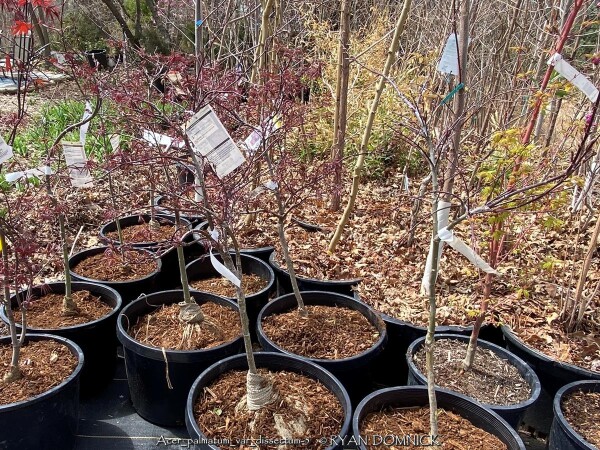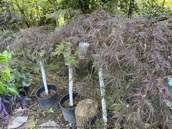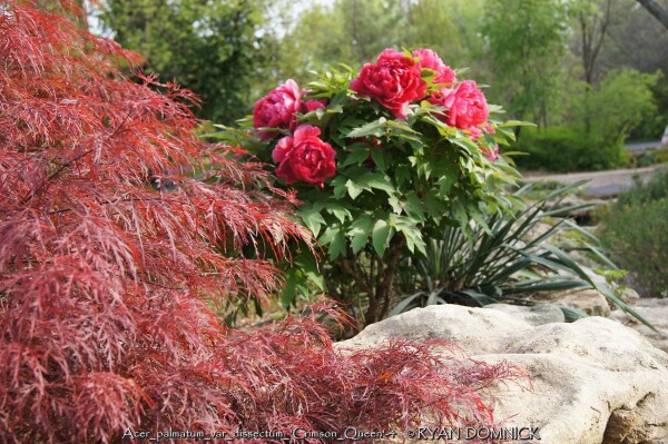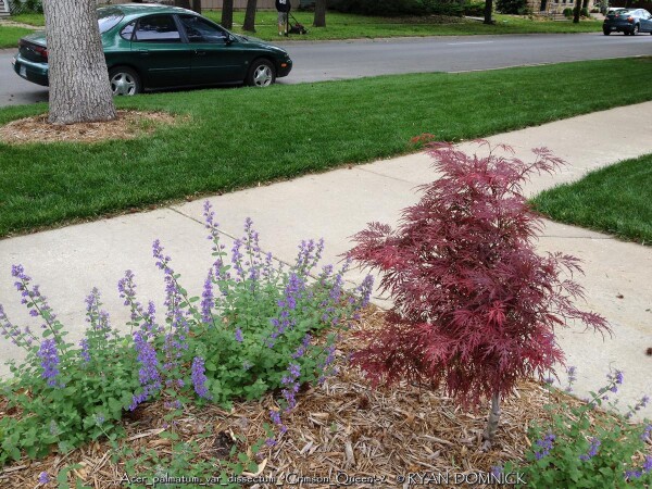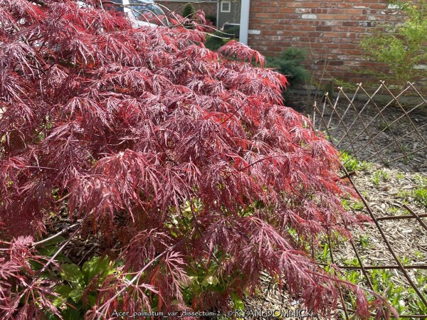 Japanese maple (Acer palmatum 'Atropurpureum') is a small tree with gracefully branched stems and palmate red-purple leaves that turn bright red in the fall. Used in Kansas landscapes small lawn tree or understory tree in full to part shade needing rich, moist soils. Even with ideal growing conditions, growth is slow. Avoid afternoon sun in the heat of summer as leaf tips will burn. I have seen tremendous late spring freeze damage on rare occasions.