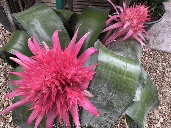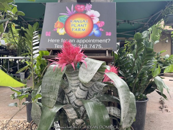 Silver Vase / Urn Plant (Aechmea fasciata) is an exotic-looking flowering plant from the bromeliad (Bromeliaceae) family. Despite its exotic appearance and tropical nature, this bromeliad adapts well to living as a potted house plant. In Kansas, use as a summer patio plant and protect from direct sunlight in mid summer and any temperatures below 50 degrees F in the spring or fall. As an epiphyte, much of its water needs are met by keeping the plants center "Urn" filled with water once per week or two. They have a shallow root systems and probably won't ever need repotted. When flowering, the flowers themselves are short-lived, but the pink and red bracts last for a few months.