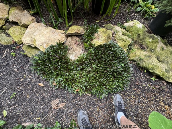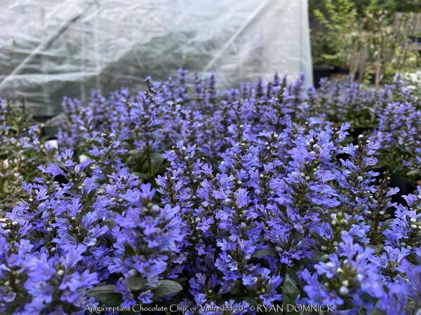 Ajugas are extremely hardy groundcovers that quickly form a dense carpet-like mat. Unlike many perennials that are grown only for their flowers, Ajuga is prized for its attractive, evergreen colorful foliage that looks nice all year. The deepest foliage color is achieved when plants are sited in full sun and in cooler temperatures although in Kansas this may result in foliage burning in summer if not adequately watered. From mid to late spring, short deep blue flower spikes stand upright above the foliage. Do not allow foliage to be covered with leaves or mulch during winter or crown rot disease may occur wiping out large patches. Ajuga reptans 'Chocolate Chip' / 'Valfredda' is the smallest and tends to spread more slowly and stay naturally compact compared to other varieties of Ajuga, making it suitable for use as an edging, rock gardens, walking trails borders and mixed container plantings. This attractive small-scale variety has tiny carpetlike purple leaves and a dense habit.