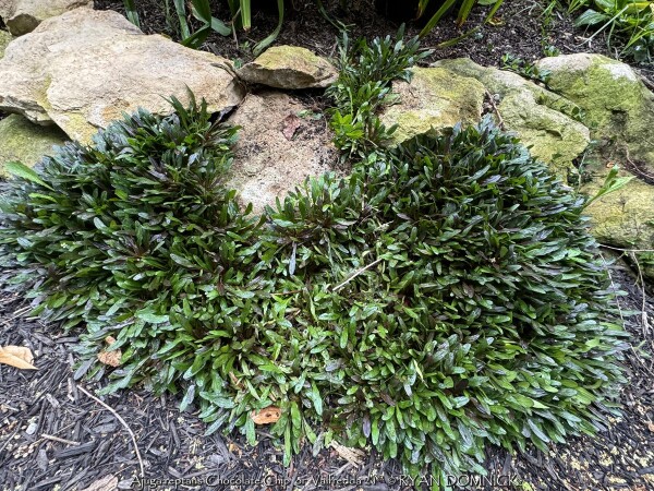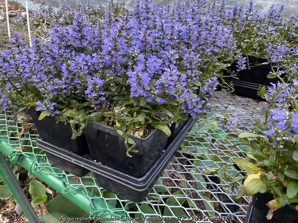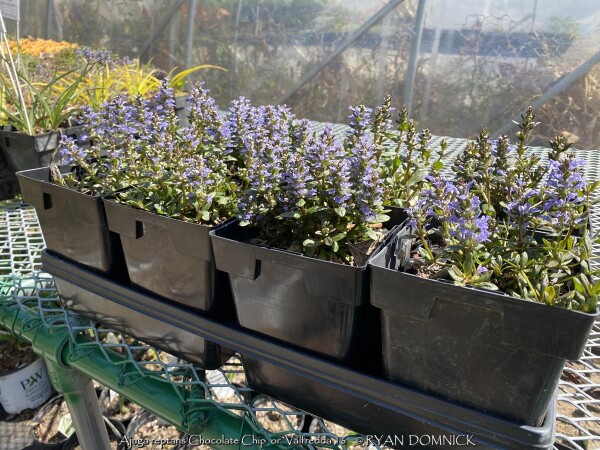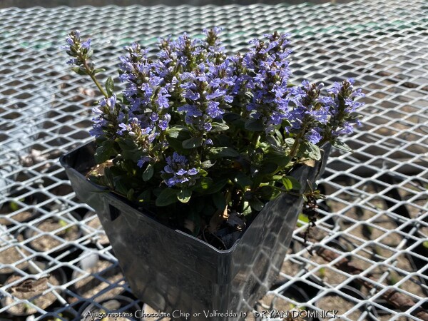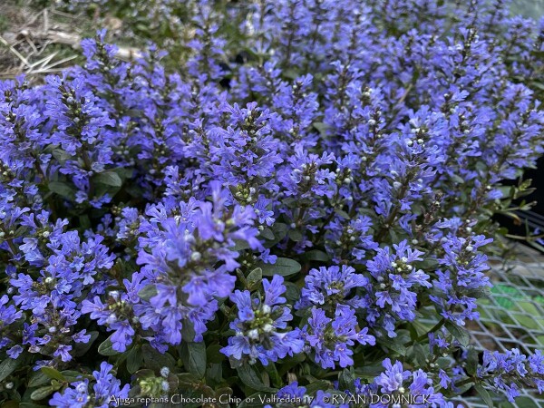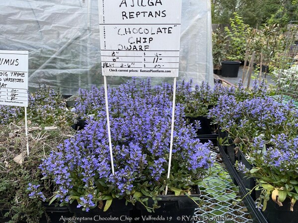 Ajugas are extremely hardy groundcovers that quickly form a dense carpet-like mat. Unlike many perennials that are grown only for their flowers, Ajuga is prized for its attractive, evergreen colorful foliage that looks nice all year. The deepest foliage color is achieved when plants are sited in full sun and in cooler temperatures although in Kansas this may result in foliage burning in summer if not adequately watered. From mid to late spring, short deep blue flower spikes stand upright above the foliage. Do not allow foliage to be covered with leaves or mulch during winter or crown rot disease may occur wiping out large patches. Ajuga reptans 'Chocolate Chip' / 'Valfredda' is the smallest and tends to spread more slowly and stay naturally compact compared to other varieties of Ajuga, making it suitable for use as an edging, rock gardens, walking trails borders and mixed container plantings. This attractive small-scale variety has tiny carpetlike purple leaves and a dense habit.