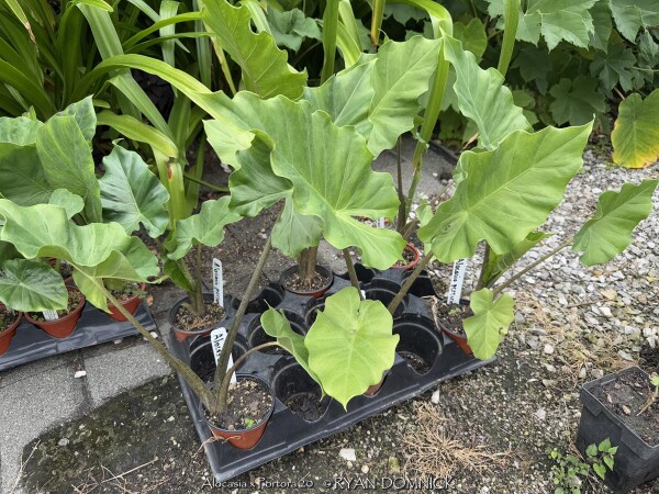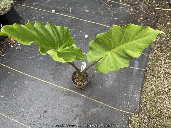 Portora Elephant Ear (Alocasia x Portora) is typically grown in warmer zones and features giant glossy green leaves creating quite a contrast for other colorful flowers in the garden. Most alocasia are large tropical and subtropical herbaceous perennials with a giant tubers native to areas with a summer monsoon and dry winter. Along with other tropicals and succulents in Kansas, elephant ears are usually grown as summer patio plants. Fertilize, water regularly, and place in full sun. Protect from temperatures below 28 degrees F and move into a cold garage or basement over the winter with minimal watering. Do not allow the pot with rootball to freeze solid or go below 25 degrees for more than a few hours. Allow to go dormant as needed with little care, just cut off dead foliage and place back out in April or May with a time-release fertilizer. Many plants will die back slowly and remain attractive inside for most of the winter. You may also plant these in the ground for an enormous tropical effect! It is possible to overwinter these in the ground in Kansas by placing a giant 12-18" mound of mulch over deeply planted rhizomes. New growth will usually be delayed until June but quickly regains full height. This plant can also grow in standing water or as a potted plant in water gardens.
