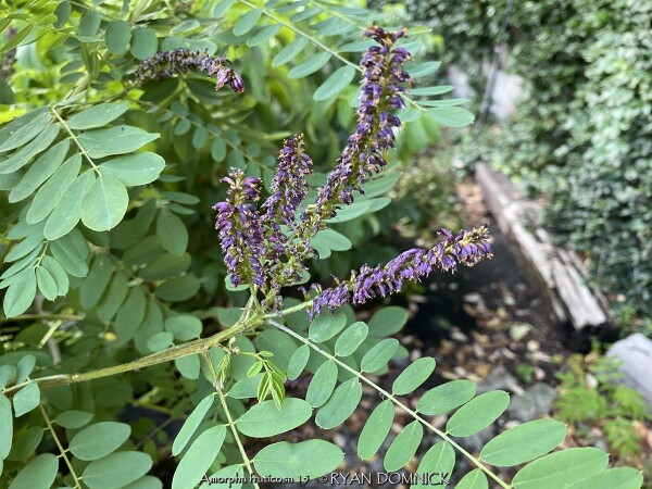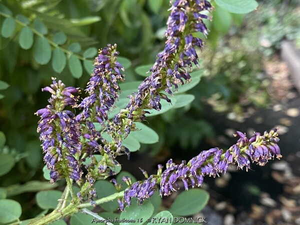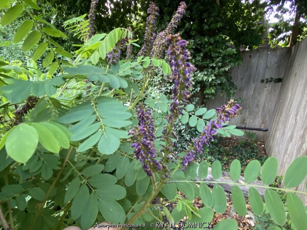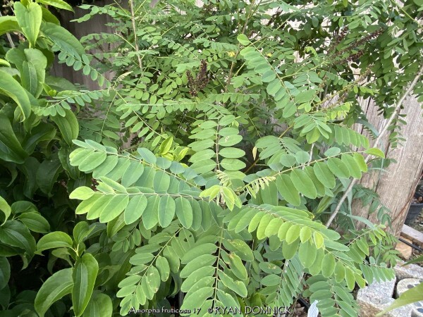 False Indigo Shrub (Amorpha fruticosa) is a 6-10 ft., loose, airy shrub which often forms dense thickets. The blooming season is relatively short but the pinnately compound leaves offers lasting interest and a "Wow" factor. The foliage is pinnately compound, fine-textured, and turns gold in the fall lasting for a week or two. Older plantings may be rejuvenated as they do develop a leggy character with the majority of their foliage on the upper third of the plant. This is a species of flowering plant in the legume family Fabaceae so it is able to make its own nitrogen. False Indigo Shrub tolerates many types of soil including wet sandy soils. Other names include desert false indigo, false indigo-bush, and bastard indigobush. It is native to North America and has potential to be invasive in parts of the country but not so much in Kansas.