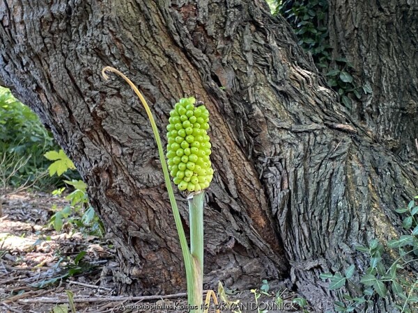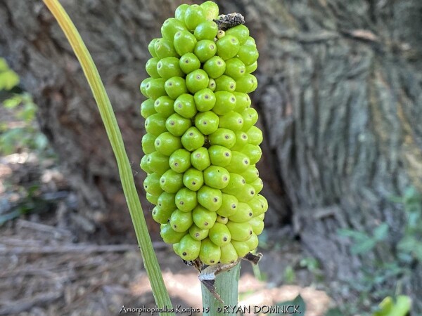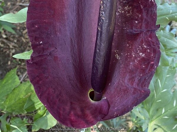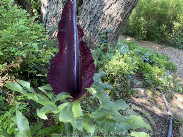Voodoo (Amorphophallus konjac) lily is a perennial tuber generally grown as a curiosity for its interesting foliage. The single leaf consists of a stalk (petiole) with mottled pinkish-gray and olive green coloration. The single intricate leaf has horizontal sections giving it a tropical umbrella-like effect. Larger tubers (about the size of a grapefruit or larger) may produce a single "flower" in spring before the foliage appears. The "flower" is actually a large shiny purple to maroon ruffled spathe. When in bloom it produces an odor like a dead animal for 1 day. This is intended to attract the carrion flies that are its natural pollinators. It is possible to overwinter these in the ground in Kansas by placing a 6-12" mound of mulch over deeply planted tubers. New growth will usually be delayed until June but quickly regains full height and will get bigger each year; buried tubers are hardy to zone 6a. They can also be grown as a flowering summer patio plant. If growing as a potted plant and trying to overwinter, allowing the foliage to frost is ok, it will not kill the root system. However, do not allow the pot with rootball to freeze solid or go below 20 degrees for more than a few hours; move into a cold garage or basement over the winter with no watering. Cut back and allow to go dormant and place entire pot back out in April or May with a time-release fertilizer. Plants can get huge and exotic looking as a potted patio plant. Grown in Japan and Korea as an edible corm.