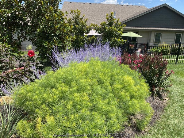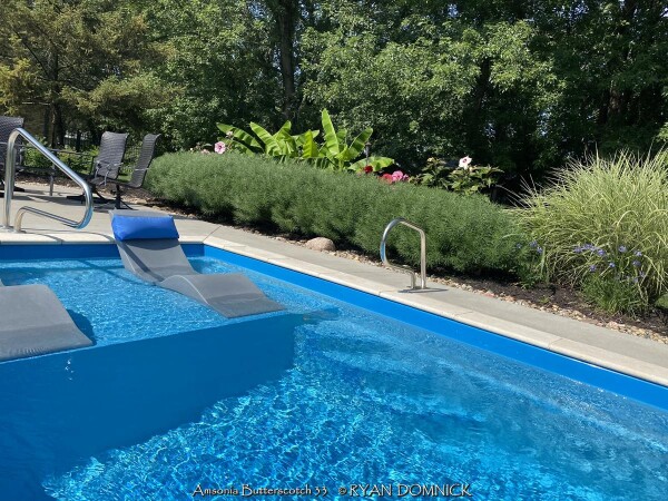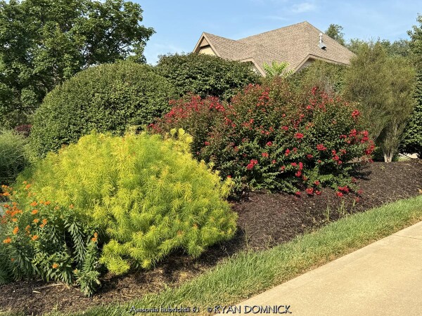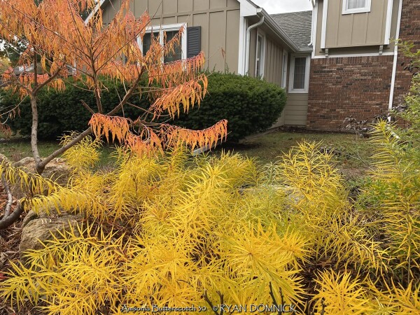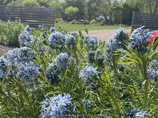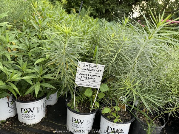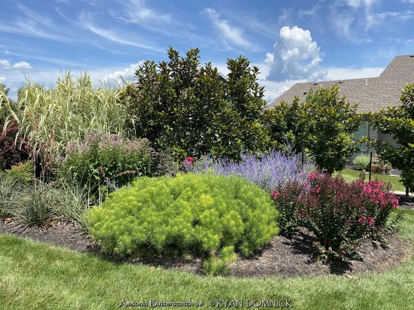 Narrow-leaf Amsonia (Amsonia hubrichtii) is clump-forming plant that is primarily grown in cultivation for its feathery green summer foliage and golden fall color. Spring flowers are powdery blue rising on 3' stalks creating a compact dense willow-like bush. The blooming season is relatively short but the pinnately compound leaves offers lasting interest and a "Wow" factor. Rich golden fall color is long-lasting and dries remaining attractive deep into the winter. No deadheading is needed and the only maintenance is cutting the plant back each winter after the fall foliage is no longer attractive. In some years with high humidity and extra summer rainfall, the foliage gets diseased and should be cut back early. Provide planting location in full sun with good air circulation to avoid this small problem. The growth is so dense that no weeds have a chance of invading a mature stand of plants. Amsonia hubrichtii is relatively new to cultivation being discovered in Arkansas in 1942 but is hardy in zones 5-9. Combine with other summer or fall flowering plants like hardy hibiscus, crapemyrtle, or penstemon. Fine-textured foliage also combines well with dark foliage, larger leaves, and dark colored walls! Great for large-scale mass plantings needing something permanent. This is a true four-seasons long-lived perennial that belongs in almost every perennial garden. Butterscotch Amsonia (Amsonia hubrichtii 'Butterscotch') is like other Amsonia in general appearance, but with improved form, reddish stems, superior rich "butterscotch" fall color, and great resistance to tip dieback. Flower color is also slightly darker blue.