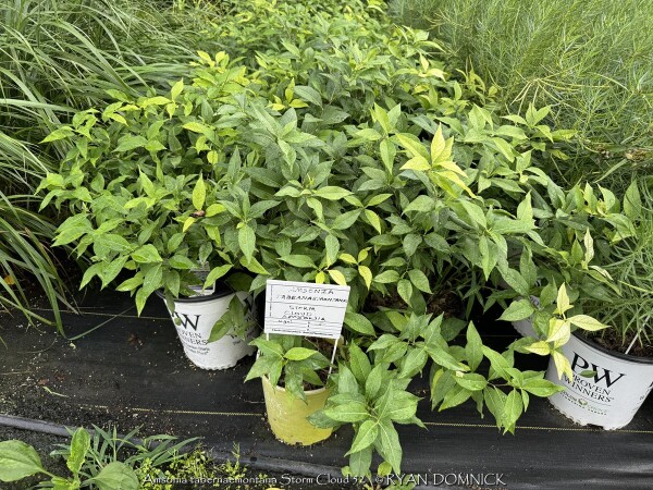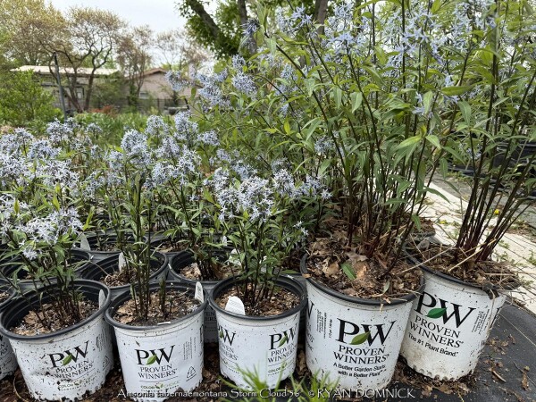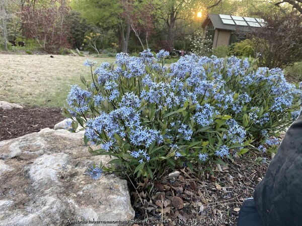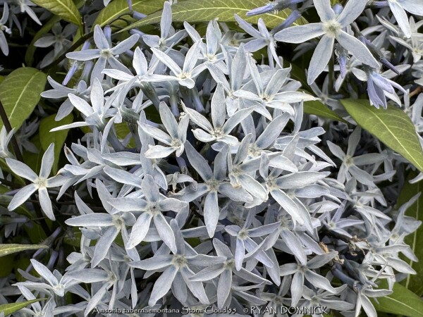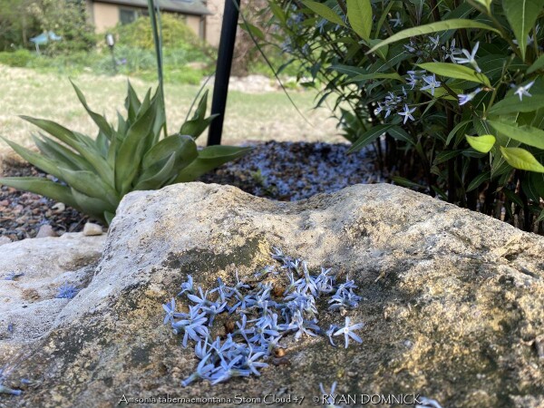 The species bluestar (Amsonia tabernaemontana) growing up to 3 feet tall and prefers a medium to moist soil, but will tolerate a range of soils in light shade, including clay. "Once it's there, it's there forever" plant! Native to East-central U.S. in open woodlands and sunny plains. Amsonia tabernaemontana 'Storm Cloud' is and improved selection with new stems emerge near-black with leaves that are very dark green with silver veins. The stems stay dark throughout spring contrasting the light periwinkle blue, star-shaped flowers that completely cover the foliage by late spring. Some reblooming may occur for many weeks afterward. Although the main interest of this plant is in spring, it maintains a great garden presence throughout the summer and fall. Its wide, mounded habit lends itself well to be used in place of shrubs in the landscape. In some years with high humidity and extra summer rainfall, the foliage gets diseased and should be cut back early. Provide planting location with good air circulation to avoid this small problem.