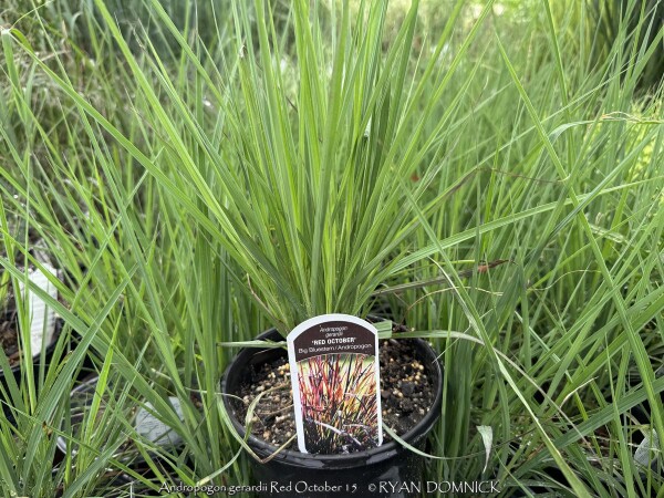Big Bluestem (Andropogon gerardii 'Red October') is easily grown in average, dry to medium, well-drained soils in full sun. It is tolerant of a wide range of soils and growing conditions but tends to flop in rich moist soils. This ornamantal grass is a tall, Kansas native, perennial, warm season grass that dominates much of the tall grass prairie extending into the Flint Hills. In fact, Big bluestem, Indiangrass, Little bluestem, and Switchgrass comprise 75% of the species in this ecosystem. It may be grown as an ornamental grass because of its attractive foliage which changes color seasonally along with its good architectural height and its interesting flower/seed heads. Andropogon gerardii 'Red October' is primarily distinguished from the species by its slightly shorter height, deeper green summer foliage and brilliant scarlet red fall color. An excellent garden performer with a clumping form and upright habit. Leaves emerge deep green with red highlights in spring, remain green through much of the summer, change to purplish-red to purple by late summer and finally turn a vivid scarlet red after first fall frost. Burgundy red flowers bloom in August. Plants typically grow to 4-5' tall.