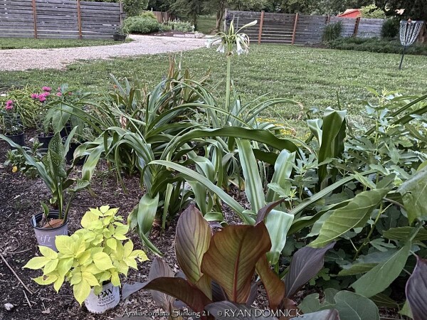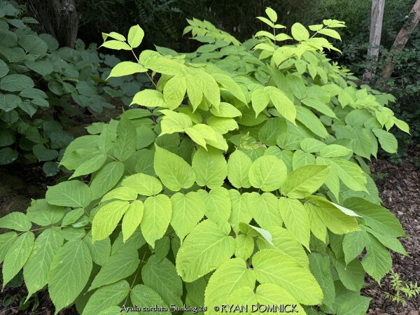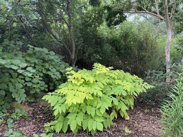 Sun King Aralia (Aralia cordata 'Sun King') is unique golden-leafed variety for the shade. The color will be brighter yellow and gold with pink leaf stalks in part sun, and more chartreuse or lime green in full shade. Tiny white flowers are insignificant and even a distraction to the gorgeous foliage. After blooming, deep purplish black, inedible berries are mildly attractive but not jaw-dropping. This unique perennial grows best in part to light shade tolerating mild drought, though if given consistent moisture it can also grow in mostly full sun. It prefers richly organic, deep loamy soil that is moist but well-drained. It typically dies back to the ground in early fall needing to be cut back then often leaving a late-season void in the garden. It re-emerges in spring to quickly form a beautiful shrub-like clump. Cold tolerance is no problem. It survived -16 degrees F and a week of single digit highs in February, 2021. No disease or pest problems other than late-season foliage decline. In Eastern Kansas, typically our 40 inches of rainfall is sufficient without extra water if planted in good soils. This is a must-have for the shade garden; combine with hostas, solomon's seal, helleborus, or ferns! Also great with shrubs such as boxwood or viburnum.
