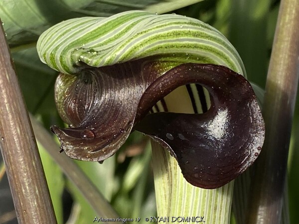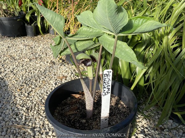Japanese Cobra Lily (Arisaema ringens) is planted for its bright green foliage and bazaar "Cobra" hood-like flowers. Native to rich Japanese forests in humusy, medium to wet, well-drained soil in part shade to full shade, it needs a good location in the garden and will be a focal point. If foliage depreciates from drought, the plants may be cut to the ground with some regrowth and flowering possible in the fall. Combine with shade garden plants that will fill the space in summer such as hostas. Although this aroid offsetts, it is rare and uncommonly available for sale.