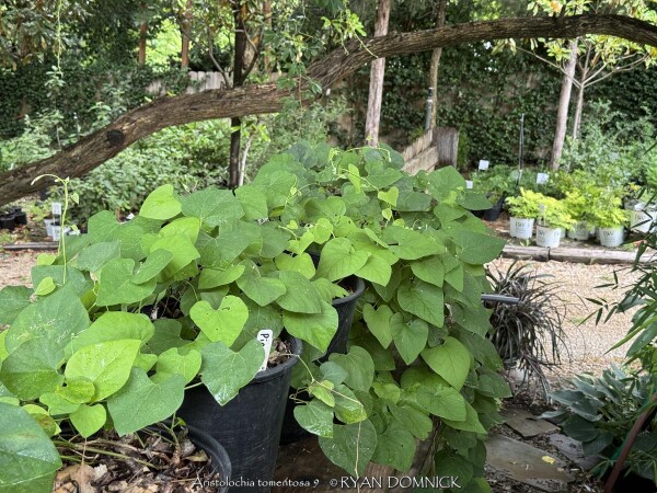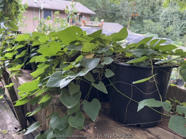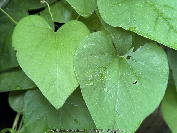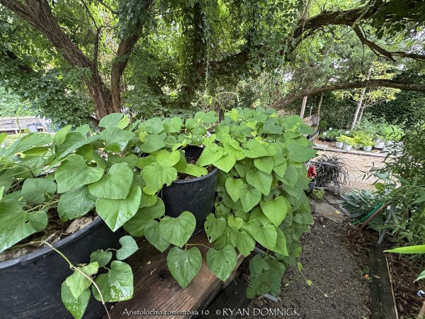 Dutchman's Pipe / Woolly Pipevine (Aristolochia tomentosa) is one of the most rapidly growing vines in out library capable of growing 15-30' in one summer! Native to eastern North America including Missouri, it typically occurs along moist woods and along streams. It can fill a large trellis or arbor with bright green foliage up to 12" across creating the most dense shade of any vine. It needs typical garden soil and regular moisture and is intolerant of drought. In Eastern Kansas, typically our 40 inches of rainfall is close to sufficient without much extra water if planted in good soils. The flowers are 1-2" across but are usually not noticed but is absolutely gorgeous with foliage alone.