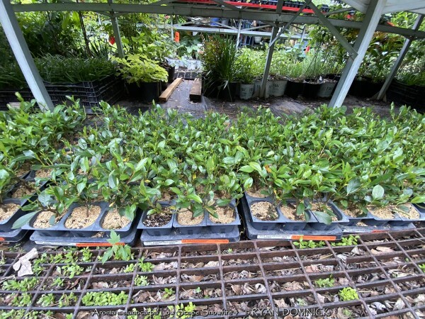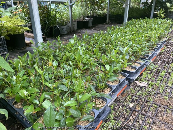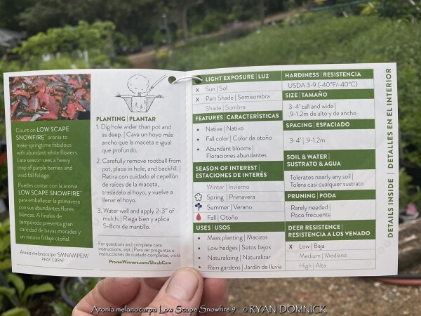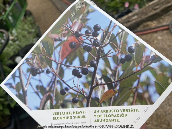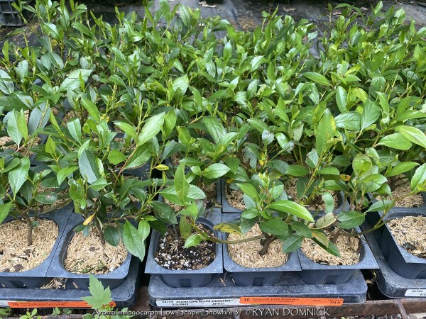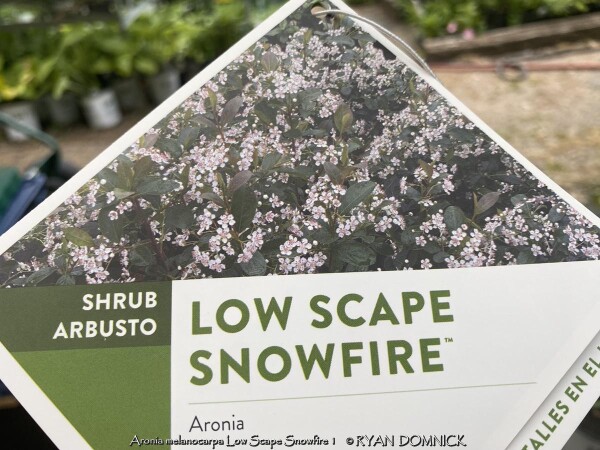 Low Scape Snowfire Aronia (Aronia melanocarpa 'Low Scape Snowfire') compact mound shaped deciduous shrub that typically grows 3-5' tall. It is native to low woods, swamps, bogs and moist thickets native from the Midwest to Canada. This 3-season shrub had appeal from spring to late fall starting with numerous white flowers, then deep green summer foliage followed by brilliant red fall color and a few blackberries. Plant in small groups or mass plantings in small gardens. Ability to withstand wet conditions makes it suitable for growing on the margins of ponds, streams, or rain gardens. Despite 'Low Scape Snowfire' being touted as "drought tolerant", in the southern part of their range (Kansas), this chokeberry will decline in dry clay or alkaline soils. Watch out for deer and rabbits can devour young plants (protect with chicken wire if needed) but established plantings can generally outgrow browsing. The common name of chokeberry is in reference to the tart and bitter taste of the fruits which are edible but so astringent as to cause choking in most of those who try: no it's not poison!. Fruits are renowned for its antioxidant rich berries and high nutritional value and sometimes used to make tasty jams and jellies if enough sugar is added. Included in our "edibles" database but depends on how hungry you are! However, 'Low Scape Snowfire' sets a heavy crop for fruit production but rather as a compact landscape 3-season shrub tolerant of wet soils. All Proven Winners® plants are legally propagated, healthy and vigorous, true to name, and tagged with color pictures and growing information.