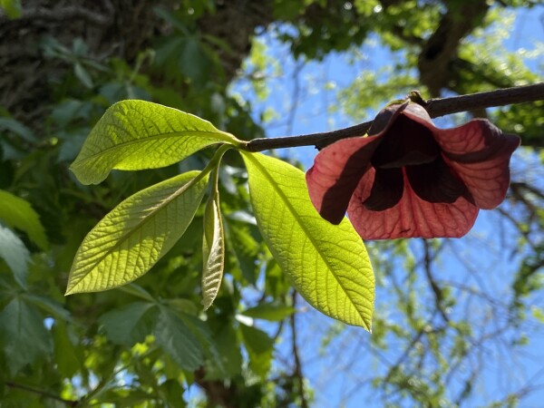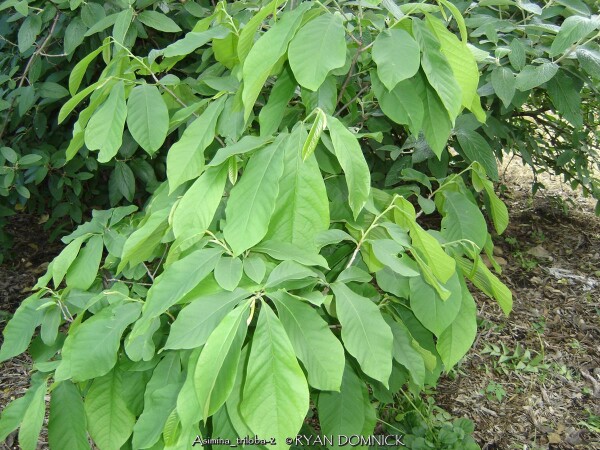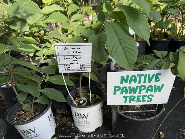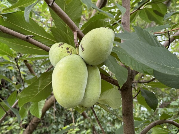 Paw Paw (Asimina triloba) is a tropical looking native understory fruit tree with large green leaves and delicious fruits. Flowers are born on old wood in the early spring and the maroon color is common of flowers meant to attract flies for pollination. Foliage is up to 12 inches long and turns a brilliant yellow in autumn for a couple weeks before falling. If cross pollination occurs, delicious fruits are produced in small clusters. The texture is custard like and taste is a mix between banana, mango, and hint of pineapple. Fruit is very fragile upon ripening and will fall to the ground and splat or be quickly devoured by animals. It is suggested that you put fruit nets around the clusters of fruit or harvest a few days earlier and allow to ripen inside. Fruit is rarely commercially available due to its fragility and short shelf-life. Cleaned fruit may be peeled frozen with seed intact: they can be picked out much easier when thawed out again Paw Paw may be eaten fresh, baked into desserts, or made into ice cream. Paw Paw is native to a large geographical area over eastern United States including Kansas. In the wild, Paw Paw grows in moist rich forest valleys in full to part shade. Best fruiting specimens can also be found on the edge of woodland or clearing in rich soil. Paw Paw tree colonies slowly spread by rhizomes and seem to occupy the forest understory sometimes for decades or centuries waiting for an opening to allow sunlight in. If a large canopy tree (such as an oak) dies or wind storm rolls through clearing a patch, new sunlight and an opening in the canopy occurs paving the way for sexual reproduction to take place (fruits) Paw Paw is somewhat tolerant of poorly drained soil's including clay but growth will be much slower. Interestingly, Paw Paws will tolerate and even need full sun when older to produce fruit. However, young saplings will quickly die in full sun from leaf burn and drought stress. If a tree is at least 4 to 6 tall and is planted in rich soil and full sun with regular irrigation, it will probably be fine. With these growing conditions, trees may grow at a median growth rate instead of slow, putting up 1 to 2 feet of new growth per year. If you have the right conditions for a Paw Paw tree, it should definitely be a part of your landscape whether you are growing for fruit production or not. There are dozens on improved cultivars available now days. In our Lawrence, KS display gardens, we are trialing several of these improved fruiting cultivars from Forrest Keeling Nursery in Missouri.