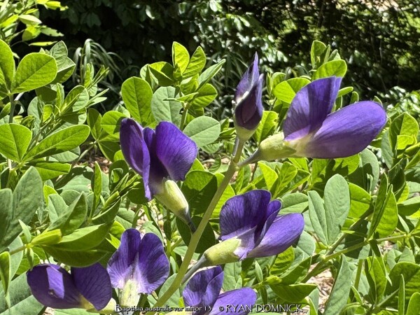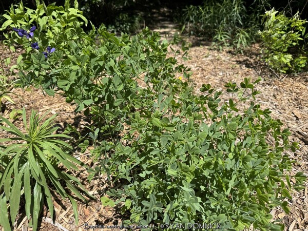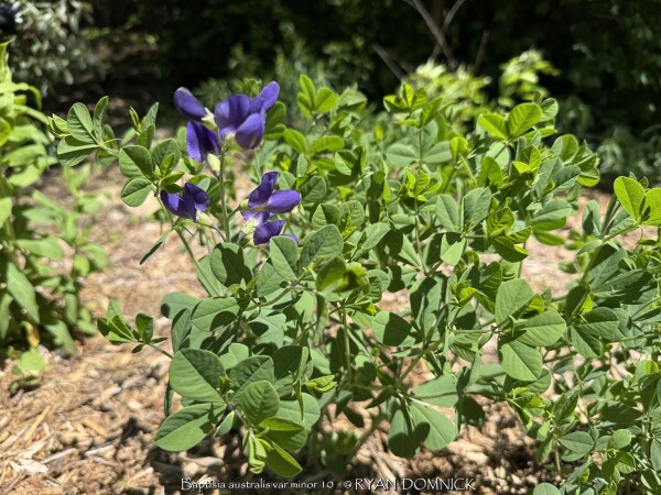 False Indigo features beautiful compact bluish green leaves arranged in groups of three. Like many members in the legume family, they are nitrogen fixing plants which means they produce their own nitrogen in the soil through a symbiotic relationship with bacteria. The flowers bloom above the foliage normally in April and May. Common baptisia flower colors include white, purple, lavender, yellow, and pink as well as uncommon colors ranging from deep purple to maroon and even coppery orange. Considered a great North American native three season plant, the foliage always emerges very attractive followed by flowers that do not need deadheading. Foliage generally lasts pretty nice through hot summers and into fall turning black with first freeze. Seed pods also turn charcoal black when ripe and have considerable ornamental interest and useful in dried flower arrangements. At some point in the fall, it can be cut down early for a clean look or left for winter interest. Baptisia generally do well in droughty clay soils in full to part sun. There is only one pest that may create problems called the Genista Broom Moth. It may occur in Kansas when weather conditions are consistently dry and over 95 degrees F. It is treatable if you act fast but if not, it only destroys the foliage late in the season and does not kill the plant. Baptisia has several enormous spreading taproots which store water and energy and can make transplanting difficult. Plantings look good as specimen or in small groups; and it's ok even preferable if they grow together and touch other plants. That helps eliminate available sunlight and discourages weeds. It is hard to picture a native plant garden or any perennial garden without Baptisia. Considered a once "it's there, it's always there" plant. Baptisia australis var. minor has a shorter and more compact stature, being native to drier Western areas compared to the species. This includes Central and Eastern Kansas, Oklahoma, Texas, and Nebraska.