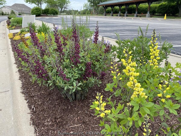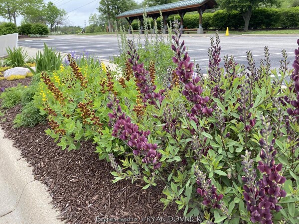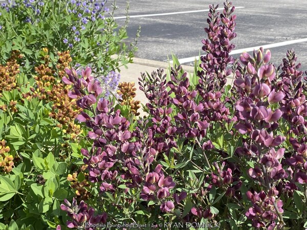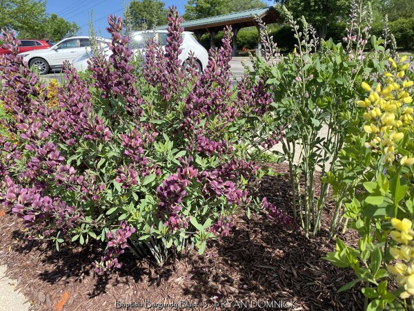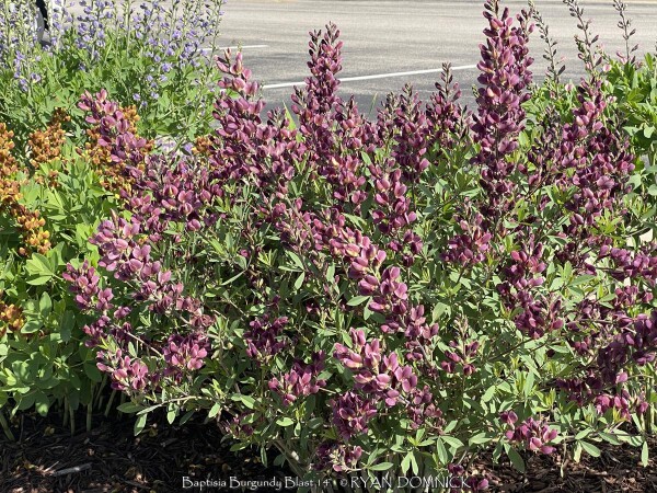 The False Indigo species (Baptisia) features beautiful compact bluish green leaves arranged in groups of three. Like many members in the legume family, they are nitrogen fixing plants which means they produce their own nitrogen in the soil through a symbiotic relationship with bacteria. The flowers bloom above the foliage normally in April and May. Common baptisia flower colors include white, purple, lavender, yellow, and pink as well as uncommon colors ranging from deep purple to maroon and even coppery orange. Considered a great North American native three season plant, the foliage always emerges very attractive followed by flowers that do not need deadheading. Foliage generally lasts pretty nice through hot summers and into fall turning black with first freeze. Seed pods also turn charcoal black when ripe and have considerable ornamental interest and useful in dried flower arrangements. At some point in the fall, it can be cut down early for a clean look or left for winter interest. Baptisia generally do well in droughty clay soils in full to part sun. There is only one pest that may create problems called the Genista Broom Moth. It may occur in Kansas when weather conditions are consistently dry and over 95 degrees F. It is treatable if you act fast but if not, it only destroys the foliage late in the season and does not kill the plant. Baptisia has several enormous spreading taproots which store water and energy and can make transplanting difficult. Plantings look good as specimen or in small groups; and it's ok even preferable if they grow together and touch other plants. That helps eliminate available sunlight and discourages weeds. It is hard to picture a native plant garden or any perennial garden without Baptisia. Considered a once "it's there, it's always there" plant. >>>>>Baptisia 'Burgundy Blast' features dark wine purple flowers are produced over very dark blue-green foliage. When it is in bloom, it is a stunning display of color. This extremely long-lived perennial could be used instead of a shrub in landscape settings, with minimal care required to thrive year after year.