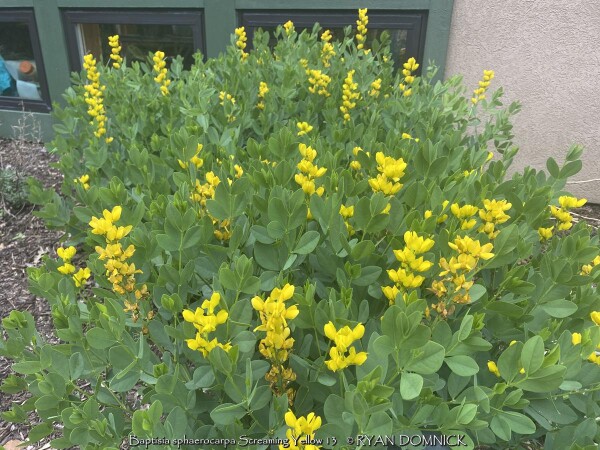 The False Indigo (Baptisia species) features beautiful compact bluish green leaves arranged in groups of three. Like many members in the legume family, they are nitrogen fixing plants which means they produce their own nitrogen in the soil through a symbiotic relationship with bacteria. The flowers bloom above the foliage normally in April and May. Common baptisia flower colors include white, purple, lavender, yellow, and pink as well as uncommon colors ranging from deep purple to maroon and even coppery orange. Considered a great North American native three season plant, the foliage always emerges very attractive followed by flowers that do not need deadheading. Foliage generally lasts pretty nice through hot summers and into fall turning black with first freeze. Seed pods also turn charcoal black when ripe and have considerable ornamental interest and useful in dried flower arrangements. At some point in the fall, it can be cut down early for a clean look or left for winter interest. Baptisia generally do well in droughty clay soils in full to part sun. There is only one pest that may create problems called the Genista Broom Moth. It may occur in Kansas when weather conditions are consistently dry and over 95 degrees F. It is treatable if you act fast but if not, it only destroys the foliage late in the season and does not kill the plant. Baptisia has several enormous spreading taproots which store water and energy and can make transplanting difficult. Plantings look good as specimen or in small groups; and it's ok even preferable if they grow together and touch other plants. That helps eliminate available sunlight and discourages weeds. It is hard to picture a native plant garden or any perennial garden without Baptisia. Considered a once "it's there, it's always there" plant. Baptisia sphaerocarpa 'Screaming Yellow' is one of the best yellows, featuring bright golden yellow flowers and more rounded seed pods.