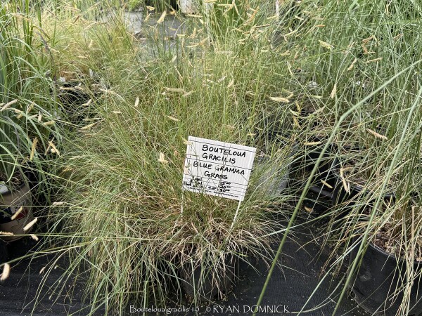 Blue Grama Grass (Bouteloua gracilis) is a long-lived, clump-forming, warm-season, perennial grass native to North America. It is one of the dominant grasses of the dry shortgrass prairies. Blue grama has very thin green to greyish leaves that turn golden brown in autumn, sometimes also developing interesting shades of orange. Purplish-tinged eyebrow-shaped flowers appear on arching stems above the foliage in early to mid-summer. Height before flowering is 12-15" increasing to 24" after flowering. As a native to the Great Plains, blue grama displays excellent drought tolerance but tolerates a wide range of soils. Avoid poorly-drained soils. In Eastern Kansas, typically our 40 inches of rainfall is sufficient without extra water. Occasionally suffering from excessive rainy spells and high humidity, foliage rust diseases can be a problem in shade or poor air circulation areas. To counteract that in Kansas, plant in full sun on berm with poor sandy, rocky, or clay soil with no irrigation. Blue grama grass works very well in an ornamental grass garden adding contrast, texture, and short stature. Use as mass plantings to create a drift that can be enjoyed from far away. For mass plantings, plant individual plants close together as they don't spread much. Dried foliage holds up very well in the winter offering a one-of-a-kind look. The only maintenance is to cut down or burn before new growth emerges. Combine with other flowering prairie native perennials for a long season of interest. Also useful as a full-sun turf grass for extremely dry or sandy soils or where buffalo grass doesn't work. It can be regularly mowed to 3-4" high.