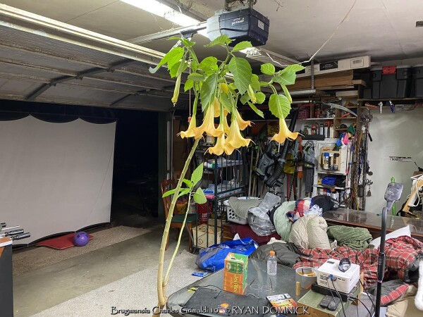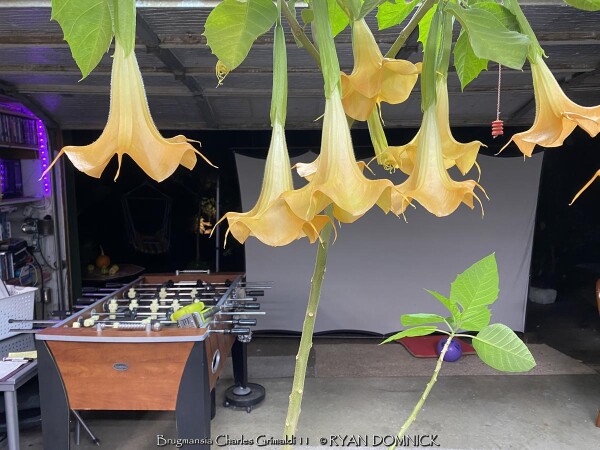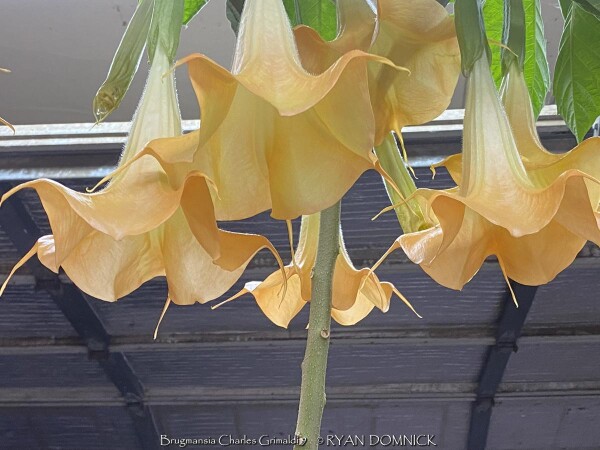 Brugmansia is a genus of seven species of flowering plants in the nightshade family Solanaceae from South America. It is typically grown in warmer zones as a shrub or tree but is extinct from the wild (only known in cultivation). Along with other tropicals and succulents in Kansas, Angel Trumpet Flower is usually grown as summer patio plant with amazing foot-long hanging flowers and sweet aroma. Water regularly and place in full sun or part shade. Protect from temperatures below 32 degrees F and move into a cold garage or basement over the winter with minimal watering. Do not allow the pot with rootball to freeze solid or go below 28 degrees for more than a few hours. Allow to go dormant as needed with little care, just cut off dead foliage/twigs and place back out in April or May with a time-release fertilizer. You may also propagate this plant easily by cutting off dormant twigs/branches and stuffing them into the ground. Notice that I didn't say rooting hormone or even being careful was necessary! Landscapers also plant these as an annual in the ground for an enormous tropical effect with fragrant flowers and growth reaching 5-8' in one season from a 1gal container! It is possible to overwinter Brugmansia in the ground in Kansas as a woody perennial. In our trial gardens in Lawrence, KS (zone 6a), a one year established specimen planted in our annual bed was mulched 12-18" thick with leaf mulch survived -10 degrees F. The dieback was deep into the ground but somehow came back from a piece of deep root. The leaf mulch was also well rotted and formed somewhat of an ice barrier insulating effect. Brugmansia species are amongst the most toxic of ornamental plants so do not eat and part of this plant! Brugmansia 'Charles Grimaldi' features orange flowers.