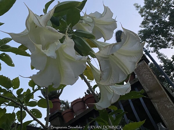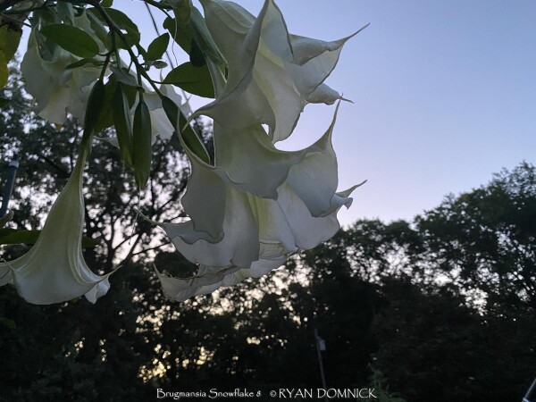 Brugmansia is a genus of seven species of flowering plants in the nightshade family Solanaceae from South America. It is typically grown in warmer zones as a shrub or tree but is extinct from the wild (only known in cultivation). Along with other tropicals and succulents in Kansas, Angel Trumpet Flower is usually grown as summer patio plant with amazing foot-long hanging flowers and sweet aroma. Water regularly and place in full sun or part shade. Protect from temperatures below 32 degrees F and move into a cold garage or basement over the winter with minimal watering. Do not allow the pot with rootball to freeze solid or go below 28 degrees for more than a few hours. Allow to go dormant as needed with little care, just cut off dead foliage/twigs and place back out in April or May with a time-release fertilizer. You may also propagate this plant easily by cutting off dormant twigs/branches and stuffing them into the ground. Notice that I didn't say rooting hormone or even being careful was necessary! Landscapers also plant these as an annual in the ground for an enormous tropical effect with fragrant flowers and growth reaching 5-8' in one season from a 1gal container! It is possible to overwinter Brugmansia in the ground in Kansas as a woody perennial. In our trial gardens in Lawrence, KS (zone 6a), a one year established specimen planted in our annual bed was mulched 12-18" thick with leaf mulch survived -10 degrees F. The dieback was deep into the ground but somehow came back from a piece of deep root. The leaf mulch was also well rotted and formed somewhat of an ice barrier insulating effect. Brugmansia species are amongst the most toxic of ornamental plants so do not eat and part of this plant! Brugmansia 'Snowflake' features pure white flowers. Our plant came from Brian's Botanicals in Kentucky.