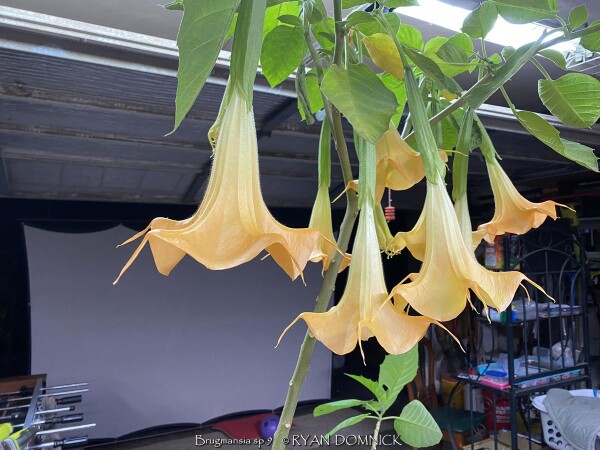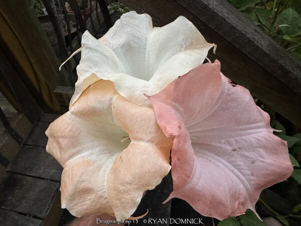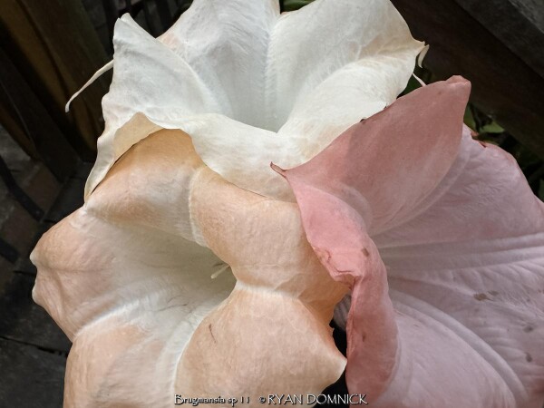 Brugmansia is a genus of seven species of flowering plants in the nightshade family Solanaceae from South America. It is typically grown in warmer zones as a shrub or tree but is extinct from the wild (only known in cultivation). Along with other tropicals and succulents in Kansas, Angel Trumpet Flower is usually grown as summer patio plant with amazing foot-long hanging flowers and sweet aroma. Water regularly and place in full sun or part shade. Protect from temperatures below 32 degrees F and move into a cold garage or basement over the winter with minimal watering. Do not allow the pot with rootball to freeze solid or go below 28 degrees for more than a few hours. Allow to go dormant as needed with little care, just cut off dead foliage/twigs and place back out in April or May with a time-release fertilizer. You may also propagate this plant easily by cutting off dormant twigs/branches and stuffing them into the ground. Notice that I didn't say rooting hormone or even being careful was necessary! Landscapers also plant these as an annual in the ground for an enormous tropical effect with fragrant flowers and growth reaching 5-8' in one season from a 1gal container! It is possible to overwinter Brugmansia in the ground in Kansas as a woody perennial. In our trial gardens in Lawrence, KS (zone 6a), a one year established specimen planted in our annual bed was mulched 12-18" thick with leaf mulch survived -10 degrees F. The dieback was deep into the ground but somehow came back from a piece of deep root. The leaf mulch was also well rotted and formed somewhat of an ice barrier insulating effect. Brugmansia species are amongst the most toxic of ornamental plants so do not eat and part of this plant! Flowers come in Orange, Red, Pink, and White.