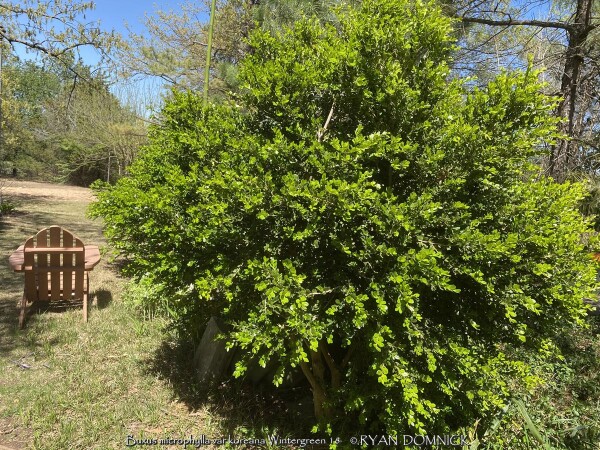 Boxwood (Buxus sp.) is a compact evergreen shrub with small round glossy green leaves. Originating in England and parts of Europe, there are many varieties ranging from small shrubs to small trees. Boxwood varieties grow rather slowly and lend themself excellently to being pruned into hedges as long as not too much is taken off at one time. After a plant achieves a certain height, you may keep it that size indefinitely with 3 to 4 times per year pruning. Boxwoods prefer part shade with rich to average well-drained soil and average moisture. Boxwoods planted in the full sun will survive but develop an burnt yellowish green color when temperatures exceed 100°F. This is usually a problem in zone 6 or further south as there are many better choices for full sun. (morning sun is okay) In zones 4-5, afternoon full sun is probably okay. Boxwoods are best known for their tolerance to dry shade even under root bound conditions. They will not survive more than a couple years under a roof overhang due to lack of moisture in the winter and spider mite problems. In the Eastern and Southeastern United States, Boxwoods have many problems including root rot, insect and disease issues. None of these are a problem in Kansas or Oklahoma with lower rainfall amounts and less humidity. In the landscape, yews offer a year-round structure. They definitely help provide a background for more interesting plants with colorful foliage and flowers. They are also very well known and used in formal garden designs. We prefer to see them less pruned and in their more natural state. Wintergreen Boxwood (Buxus microphylla var. koreana 'Wintergreen') has improved shinier light green spring foliage darkening by summer. Foliage maintains a "better" green in winter compared to other varieties. There is also no die back or twig blight problems like with Green Velvet Boxwood.