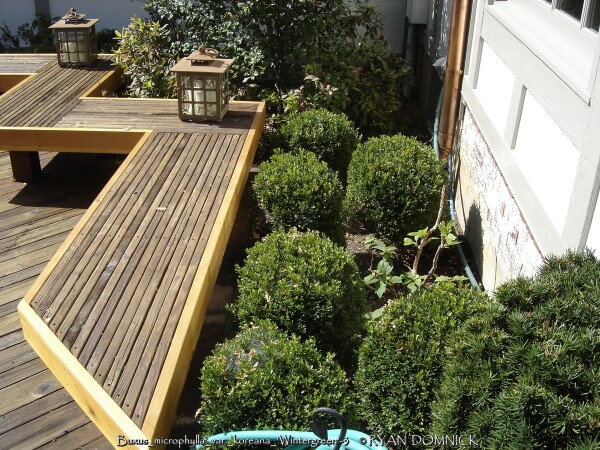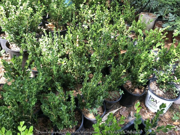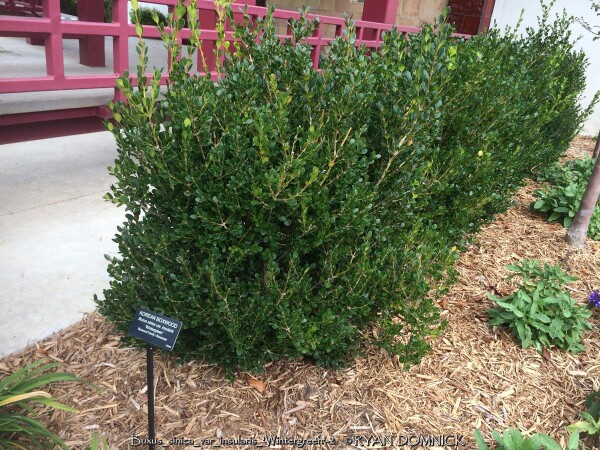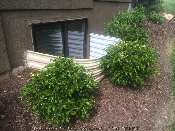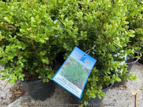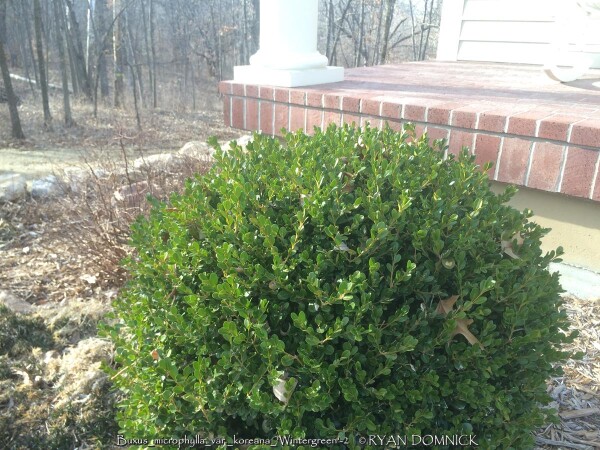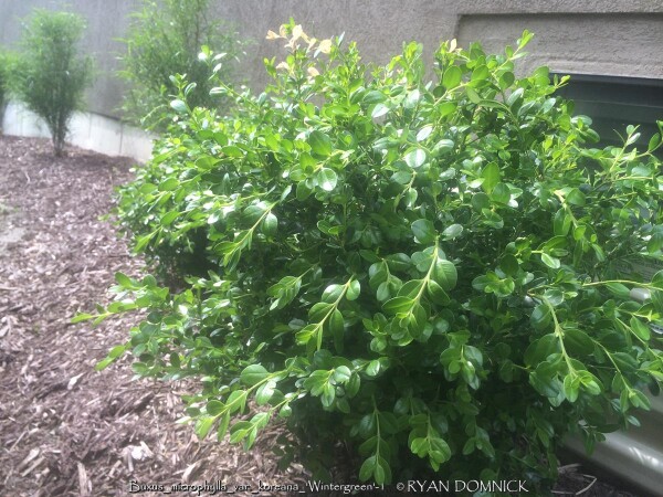 Boxwood (Buxus sp.) is a compact evergreen shrub with small round glossy green leaves. Originating in England and parts of Europe, there are many varieties ranging from small shrubs to small trees. Boxwood varieties grow rather slowly and lend themself excellently to being pruned into hedges as long as not too much is taken off at one time. After a plant achieves a certain height, you may keep it that size indefinitely with 3 to 4 times per year pruning. Boxwoods prefer part shade with rich to average well-drained soil and average moisture. Boxwoods planted in the full sun will survive but develop an burnt yellowish green color when temperatures exceed 100°F. This is usually a problem in zone 6 or further south as there are many better choices for full sun. (morning sun is okay) In zones 4-5, afternoon full sun is probably okay. Boxwoods are best known for their tolerance to dry shade even under root bound conditions. They will not survive more than a couple years under a roof overhang due to lack of moisture in the winter and spider mite problems. In the Eastern and Southeastern United States, Boxwoods have many problems including root rot, insect and disease issues. None of these are a problem in Kansas or Oklahoma with lower rainfall amounts and less humidity. In the landscape, yews offer a year-round structure. They definitely help provide a background for more interesting plants with colorful foliage and flowers. They are also very well known and used in formal garden designs. We prefer to see them less pruned and in their more natural state. Wintergreen Boxwood (Buxus microphylla var. koreana 'Wintergreen') has improved shinier light green spring foliage darkening by summer. Foliage maintains a "better" green in winter compared to other varieties. There is also no die back or twig blight problems like with Green Velvet Boxwood.