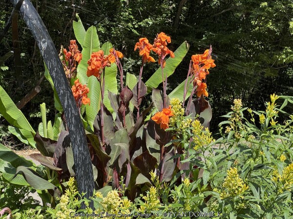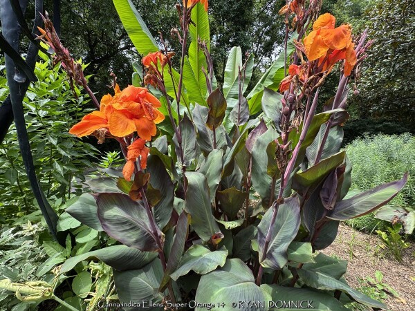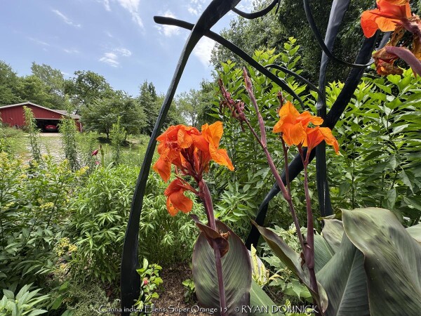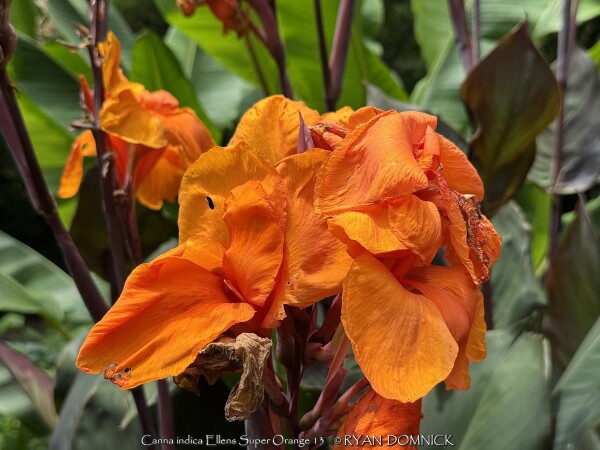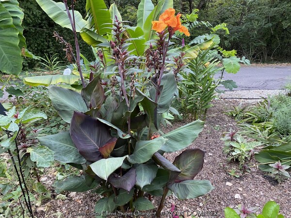 Cannas are typically grown for their continuous summer flowers and vertical wide-leaf foliage. The plants are large tropical and subtropical herbaceous perennials with a rhizomatous rootstock native to areas with a summer monsoon and dry winter. They can be grown as flowering summer patio plants. If growing as a potted plant and trying to overwinter, allowing the foliage to frost is ok, it will not kill the root system. However, do not allow the pot with rootball to freeze solid or go below 20 degrees for more than a few hours; move into a cold garage or basement over the winter with no watering. Cut back and allow to go dormant and place entire pot back out in April or May with a time-release fertilizer. Another more labor intensive way to overwinter cannas is to remove them from the dirt, dust with fungicide, place in box with sawdust, and keep in the refrigerator. We consider this method old-fashioned and too much work but ok if you only want to save a few pieces. If digging from the ground, just save a chunk with the dirt intact and place into a large pot in the garage. During the growing season, fertilize, water regularly, and place in full sun. You may also plant these in the ground for an enormous tropical effect! It is possible to overwinter these in the ground in Kansas by mulching 4-8" thick over deeply planted rhizomes. New growth will usually be slightly delayed but quick to regain full height. In our trial gardens in Lawrence, KS (zone 6a), the following varieties survived after being mulched 6-12" with leaf mulch to -17 degrees F. (Canna 'Daddy's Buckaroo',Canna 'Omega',Canna indica 'Red Stripe',Canna indica 'Ellen's Super Orange', Canna indica 'Wyoming') During the arctic blast of February, 2021, lows down to -17 degrees F on Feb 16th, 2021 were recorded. The longevity of this cold blast was also impressive: 10 days on a row with highs of 10-15 degrees F or lower, 8 nights of lows in the single digits and negatives, and 36 straight hours of 0 degrees F and mostly lower. Canna indica 'Ellen's Super Orange' is a tall variety with reddish-green leaves and bright orange flowers. This variety is among the most cold hardy of the cannas due to its vigorous deep growing rhizomes. Our original plant came from a residential garden in Lawrence, KS.