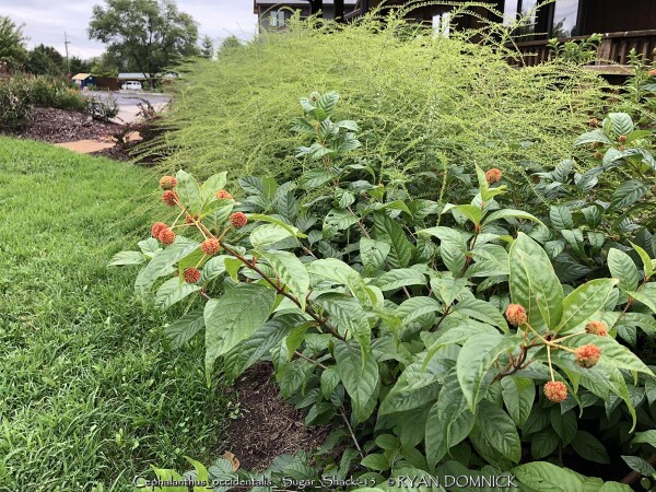 Button bush (Cephalanthus occidentalis) is a beautiful rounded shrub with glossy green leaves that turn reddish maroon in fall. White flowers are very unique (and look like a coronavirus) consisting of small spheres with protruding anthers. Bloom occurs all summer and are attractive to many different bee and butterfly species, including the swallowtail butterfly. Red fruiting heads appear in late summer adding to the ornamental appeal! In its native habitat covering most of Eastern United States including disjunct populations in Arizona, California, and Mexico, this wetland shrub can be found in low-lying areas. This includes swamps, marshes, bogs, wetlands, and along the edges of ponds, streams, and rivers. In Eastern Kansas, this is a no-brainer shrub to small tree for average garden soils including heavy clay and useful for rain gardens. Adapts to a wide range of soils except dry ones if in poor soils. Tolerant of moderate drought once established especially if in moisture-retentive rich soils. As a testament to this plants survivability, Clinton Lake and Perry Lake located in NE kansas flooded in 2020 with areas of shore-line underwater for the entire growing season. This killed every other plant species was killed except for buttonbush: all top growth was killed but new shoots from the root systems of thousands of plants along the shore resumed the following year when water receded. Basically, these plants survived over 18 months with no growth from fall of 2019 to spring of 2021. This plant can also grow in permanent standing water or as a potted plant in water gardens. Sugar Shack® Buttonbush (Cephalanthus occidentalis 'Sugar Shack') in a new Proven Winners variety! Although buttonbush has long been prized as a native and great for rain gardens, it was way too big for most landscapes. Not anymore! They cut the size in half and added improved colorful red fruit and glossy foliage. Add in cool looking, fragrant white flowers and you've got a delightful plant that shines from spring to fall. Blooming on new wood, button bush may be trimmed in early spring. Complete rejuvenation may also be done if plants get too big.