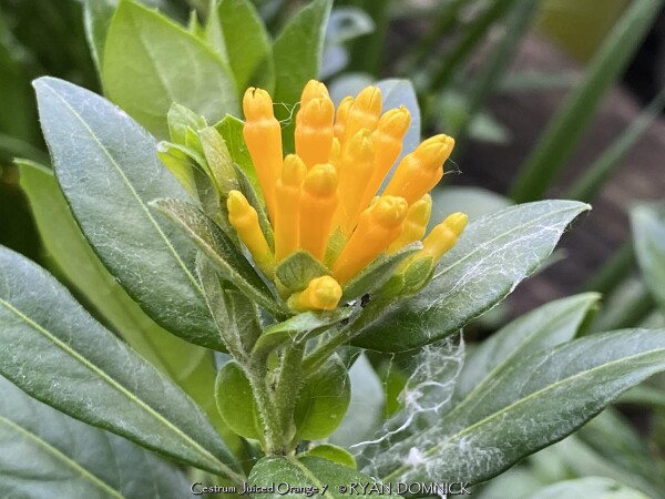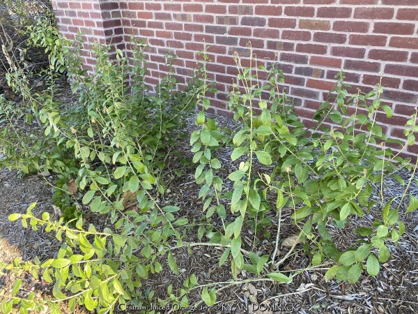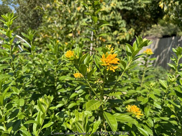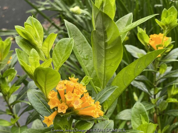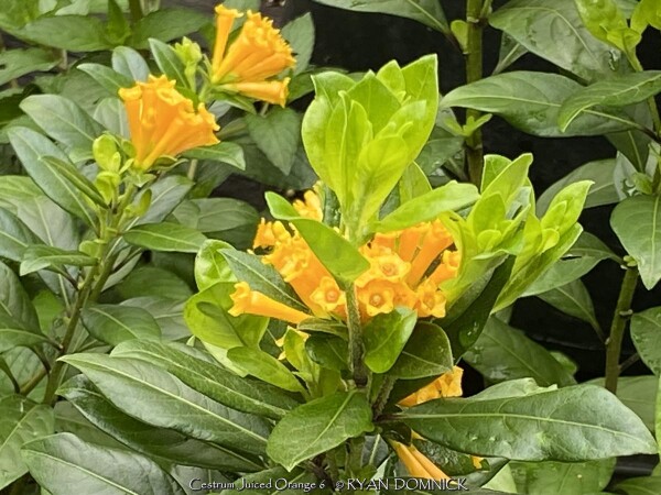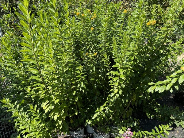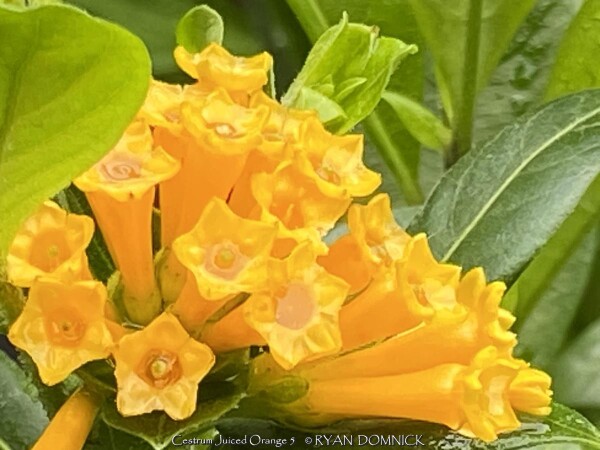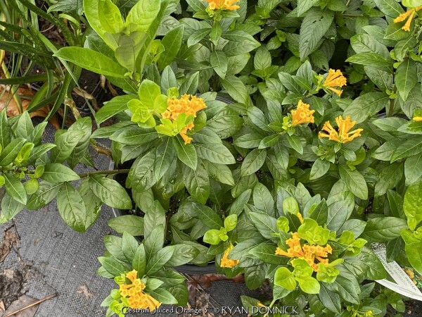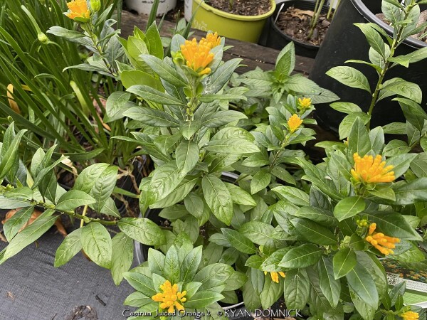 Jessamine / Hardy Cestrums are relatively new and upcomming plant. Brighten up summertime with Juiced® Orange jessamine. This compact hybrid jessamine has deliciously colorful blooms and bright glossy foliage. These citrus-hued, tubular flowers attract both butterflies and hummingbirds. Blooming from spring to frost, this tropical evergreen has dark, glossy foliage and a superior, bushy habit along with easy care: no need to trim to keep the blooms coming! In colder climates, it can be grown as a patio plant and overwintered in a sunroom. This is a fun and colorful South American native that offers uniqueness and novelty that everyone will crave. Mostly listed as hardy to zone 7, you can easily push this into zone 6 with a layer of thick winter mulch. Many visitors in the display garden are amazed by the uniqueness and beauty. It really resembles a "yellow flowering lilac" with flowers and foliage. Similar to a Crapemyrtle, Cestrums are hardy outside when grown as a perennial and cut back hard each year. It will re-grow from the roots and still flower on new wood by mid-summer. During the growing season, fertilize, water regularly, and plant in full sun. Plant a little deep at first; about 2-3" deep with 4-6" of mulch. In our trial gardens in Lawrence, KS (zone 6a), the following varieties survived after being mulched 6-12" with leaf mulch. During the arctic blast of January, 2024, lows down to -11 degrees F on Jan 10th, 2024 were recorded. The longevity of this cold blast was also impressive: 4 days on a row with single digit highs including 1 day with a negative high(-2F), 4 nights of lows in negatives(-8For lower), and 48 straight hours of 0 degrees F and mostly lower. PROVEN WINNERS variety.