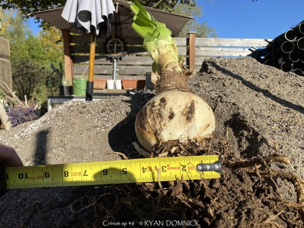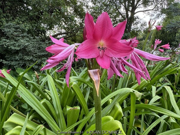Crinums are tough, long-lived perennial bulbs with strappy leaves and fragrant, funnel-shaped flowers. In areas where the bulbs are hardy, (zones 5/6-10) these plants can reach as much as 4 feet across and bloom all summer. Crinums can live for 200-300 years in the South often found growing in cemeteries and abandoned home sites with little or no attention. The plants are native to southeast Asia often in areas with a summer monsoon and dry winter. They can also be grown as flowering summer patio plants. If growing as a potted plant and trying to overwinter, allowing the foliage to frost is ok, it will not kill the root system. However, do not allow the pot with rootball to freeze solid or go below 20 degrees for more than a few hours; move into a cold garage or basement over the winter with no watering. Cut back and allow to go dormant and place entire pot back out in April or May with a time-release fertilizer. During the growing season, fertilize, water regularly, and place in full sun. You may also plant these in the ground for an enormous tropical effect! It is easy to overwinter these in the ground in Kansas with mulch or no mulch! The trick is to plant them deep: an extra 4-6" deeper than grade or with neck of bulb completely buried. Crinums are extremely adaptable thriving in either in dry or in boggy soils. Crinums are tough, low maintenance bulbs which make them perfect for rain gardens, and although drought-tolerant, crinums bloom more if well-watered. This plant can also grow in standing water or as a potted plant in water gardens. Unlike southern climates, crinums in Kansas need full sun to grow and flower in our shorter growing season. Crinum are more cold hardy than most authorities publish; easily pushing into zone 5 for some varieties. In our trial gardens in Lawrence, KS (zone 6a), the following varieties survived after being mulched 6-12" with leaf mulch to -17 degrees F. (Crinum 'Infusion', Crinum tweedianum, Crinum 'Super Ellen', Crinum x powellii, Crinum 'White Prince') During the arctic blast of February, 2021, lows down to -17 degrees F on Feb 16th, 2021 were recorded. The longevity of this cold blast was also impressive: 10 days on a row with highs of 10-15 degrees F or lower, 8 nights of lows in the single digits and negatives, and 36 straight hours of 0 degrees F and mostly lower. No crinums were lost or harmed during this event! Crinum 'Infusion' is a large crinum up to 48" tall with magenta flowers. Offsets heavily. Hardy to Zone 5b.