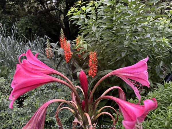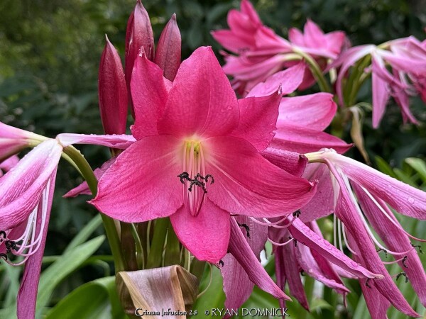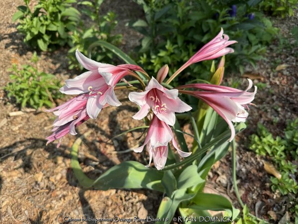 Crinums are tough, long-lived perennial bulbs with strappy leaves and fragrant, funnel-shaped flowers. In areas where the bulbs are hardy, (zones 5/6-10) these plants can reach as much as 4 feet across and bloom all summer. Crinums can live for 200-300 years in the South often found growing in cemeteries and abandoned home sites with little or no attention. The plants are native to southeast Asia often in areas with a summer monsoon and dry winter. They can also be grown as flowering summer patio plants. If growing as a potted plant and trying to overwinter, allowing the foliage to frost is ok, it will not kill the root system. However, do not allow the pot with rootball to freeze solid or go below 20 degrees for more than a few hours; move into a cold garage or basement over the winter with no watering. Cut back and allow to go dormant and place entire pot back out in April or May with a time-release fertilizer. During the growing season, fertilize, water regularly, and place in full sun. You may also plant these in the ground for an enormous tropical effect! It is easy to overwinter these in the ground in Kansas with mulch or no mulch! The trick is to plant them deep: an extra 4-6" deeper than grade or with neck of bulb completely buried. Crinums are extremely adaptable thriving in either in dry or in boggy soils. Crinums are tough, low maintenance bulbs which make them perfect for rain gardens, and although drought-tolerant, crinums bloom more if well-watered. This plant can also grow in standing water or as a potted plant in water gardens. Unlike southern climates, crinums in Kansas need full sun to grow and flower in our shorter growing season. Crinum are more cold hardy than most authorities publish; easily pushing into zone 5 for some varieties. In our trial gardens in Lawrence, KS (zone 6a), the following varieties survived after being mulched 6-12" with leaf mulch to -17 degrees F. (Crinum 'Infusion', Crinum tweedianum, Crinum 'Super Ellen', Crinum x powellii, Crinum 'White Prince') During the arctic blast of February, 2021, lows down to -17 degrees F on Feb 16th, 2021 were recorded. The longevity of this cold blast was also impressive: 10 days on a row with highs of 10-15 degrees F or lower, 8 nights of lows in the single digits and negatives, and 36 straight hours of 0 degrees F and mostly lower. No crinums were lost or harmed during this event!