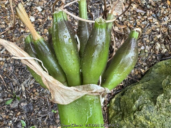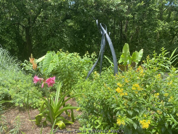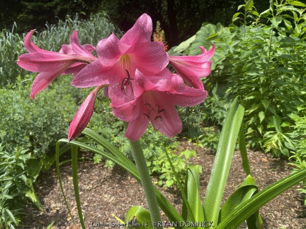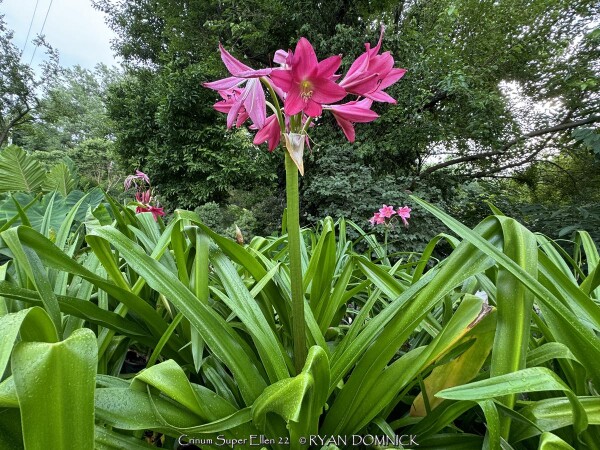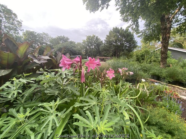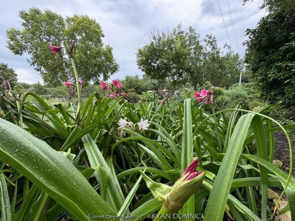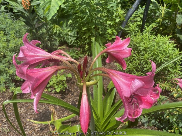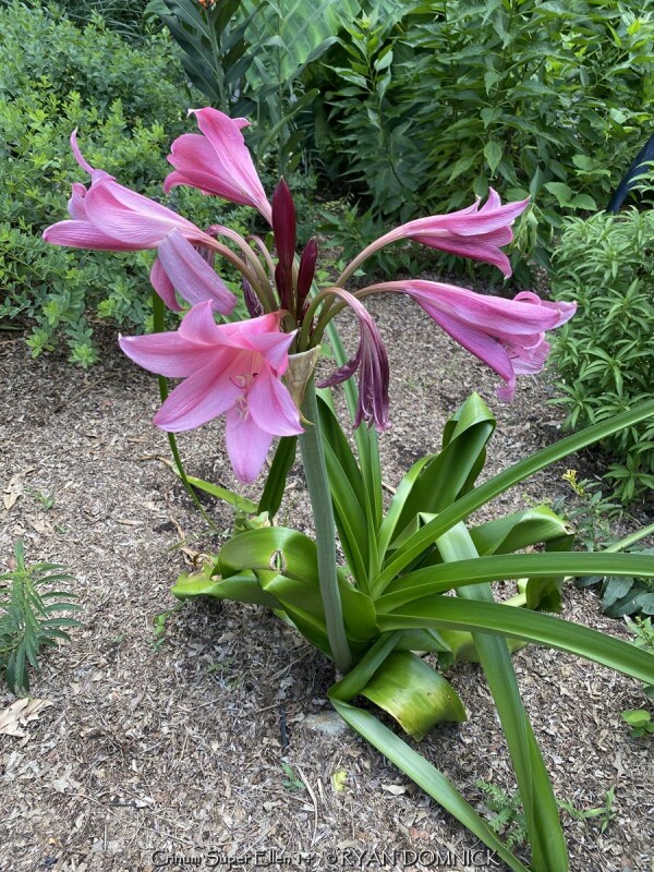 Crinums are tough, long-lived perennial bulbs with strappy leaves and fragrant, funnel-shaped flowers. In areas where the bulbs are hardy, (zones 5/6-10) these plants can reach as much as 4 feet across and bloom all summer. Crinums can live for 200-300 years in the South often found growing in cemeteries and abandoned home sites with little or no attention. The plants are native to southeast Asia often in areas with a summer monsoon and dry winter. They can also be grown as flowering summer patio plants. If growing as a potted plant and trying to overwinter, allowing the foliage to frost is ok, it will not kill the root system. However, do not allow the pot with rootball to freeze solid or go below 20 degrees for more than a few hours; move into a cold garage or basement over the winter with no watering. Cut back and allow to go dormant and place entire pot back out in April or May with a time-release fertilizer. During the growing season, fertilize, water regularly, and place in full sun. You may also plant these in the ground for an enormous tropical effect! It is easy to overwinter these in the ground in Kansas with mulch or no mulch! The trick is to plant them deep: an extra 4-6" deeper than grade or with neck of bulb completely buried. Crinums are extremely adaptable thriving in either in dry or in boggy soils. Crinums are tough, low maintenance bulbs which make them perfect for rain gardens, and although drought-tolerant, crinums bloom more if well-watered. This plant can also grow in standing water or as a potted plant in water gardens. Unlike southern climates, crinums in Kansas need full sun to grow and flower in our shorter growing season. Crinum are more cold hardy than most authorities publish; easily pushing into zone 5 for some varieties. In our trial gardens in Lawrence, KS (zone 6a), the following varieties survived after being mulched 6-12" with leaf mulch to -17 degrees F. (Crinum 'Infusion', Crinum tweeedianum, Crinum 'Super Ellen', Crinum x powellii, Crinum 'White Prince') During the arctic blast of February, 2021, lows down to -17 degrees F on Feb 16th, 2021 were recorded. The longevity of this cold blast was also impressive: 10 days on a row with highs of 10-15 degrees F or lower, 8 nights of lows in the single digits and negatives, and 36 straight hours of 0 degrees F and mostly lower. No crinums were lost or harmed during this event! Crinum 'Super Ellen' is a massive crinum (cross of Crinum 'Ellen Bosanquet' x Crinum bulbispermum) up to 60" tall with magenta flowers. Offsets heavily.
