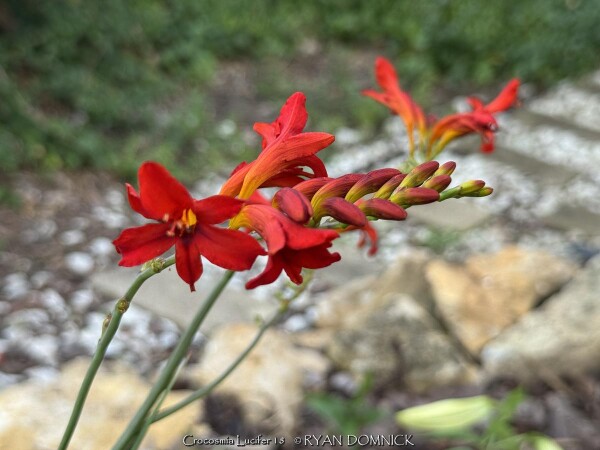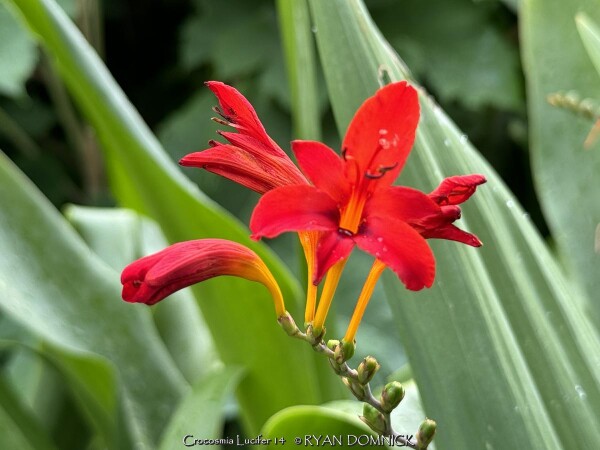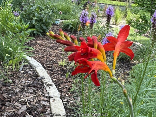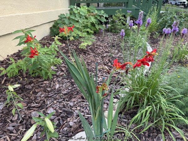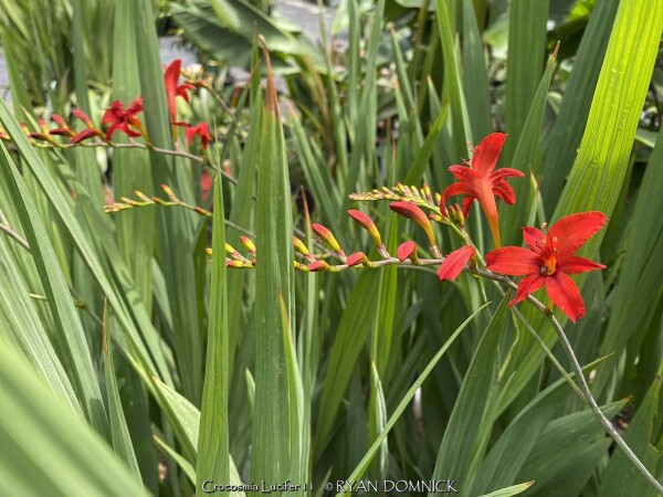 Lucifer Red Crocosmia (Crocosmia 'Lucifer') are typically grown for their bright red mid-summer flowers and vertical iris-leaf foliage. The plants are temperate and subtropical herbaceous perennial bulbs native to areas with a summer wet season and dry winter. Crocosmia are hardy outside as a perennial when established and with minimal effort at least up to zone 6a. During the growing season, fertilize, water regularly, and plant in full sun. Plant these bulbs in the ground at least 4-6" deep with 3-4" of mulch to enjoy a wonderful tropical flowering effect! Foliage may look bedwraggled by fall so it is ok to cut back foliage at that time. They can also be grown as a flowering summer patio plant. If growing as a potted plant and trying to overwinter, allowing the foliage to frost is ok, it will not kill the root system. However, do not allow the pot with rootball to freeze solid or go below 20 degrees for more than a few hours; move into a cold garage or basement over the winter with no watering. Cut back and allow to go dormant and place entire pot back out in April or May with a time-release fertilizer. Another more labor intensive way to overwinter crocosmia is to remove them from the dirt, dust with fungicide, place in box with sawdust, and keep in the refrigerator. We consider this method old-fashioned and too much work but ok if you only want to save a few bulbs. If digging from the ground in colder zones, just save a big chunk with the dirt intact and place into a large pot in the garage. In a customer's garden in Lawrence, KS (zone 6a), four established specimens planted over 4-6" deep and mulched 2-3" with wood mulch survived -17 degrees F. During the arctic blast of February, 2021, lows down to -17 degrees F on Feb 16th, 2021 were recorded. The longevity of this cold blast was also impressive: 10 days on a row with highs of 10-15 degrees F or lower, 8 nights of lows in the single digits and negatives, and 36 straight hours of 0 degrees F and mostly lower.