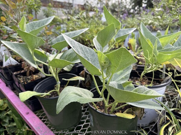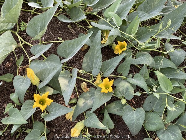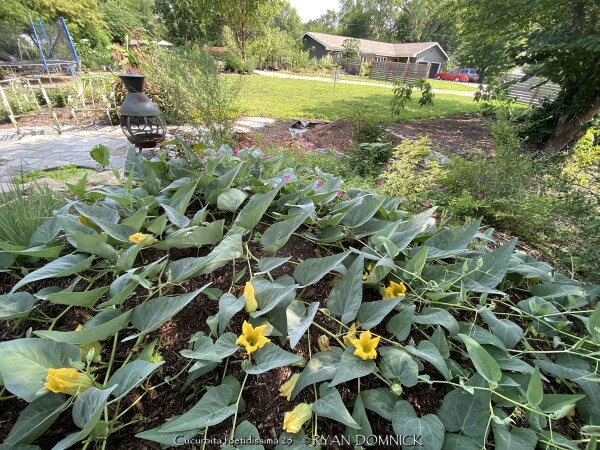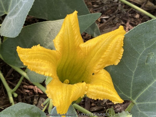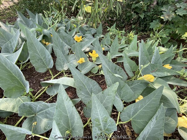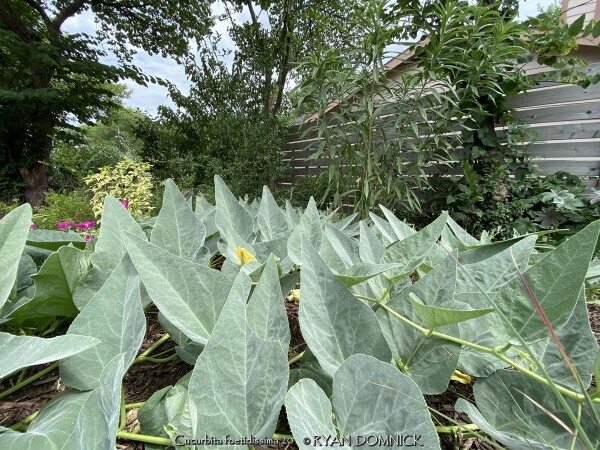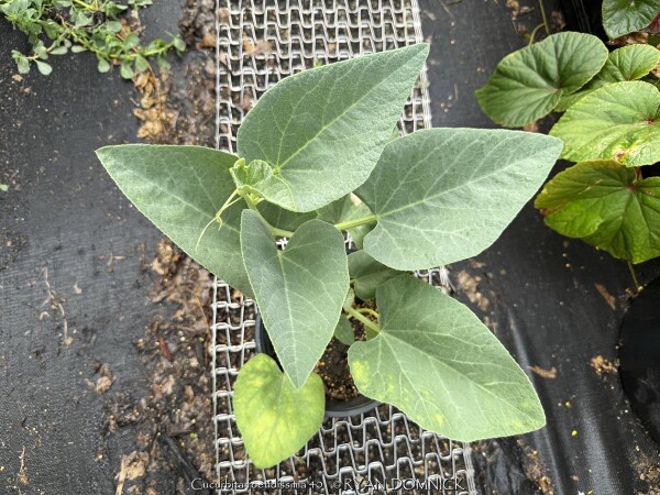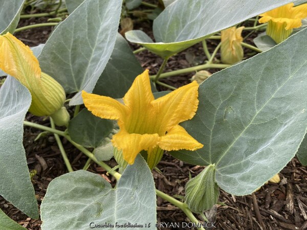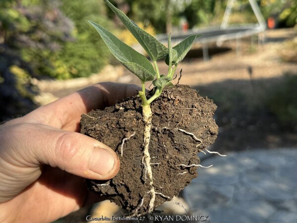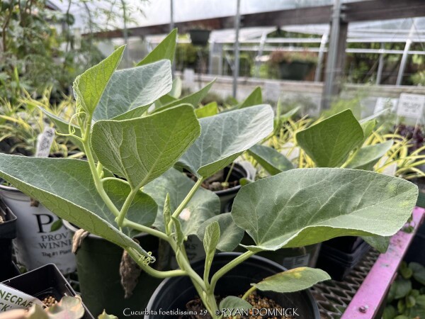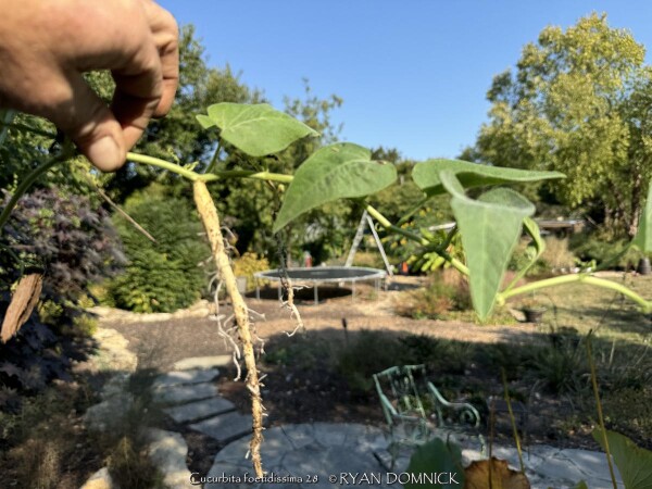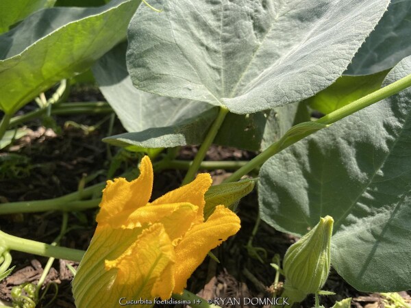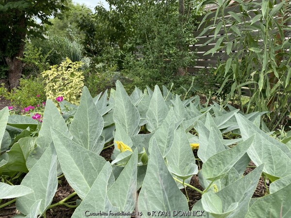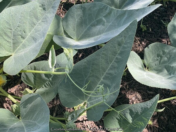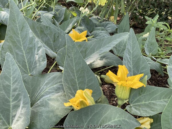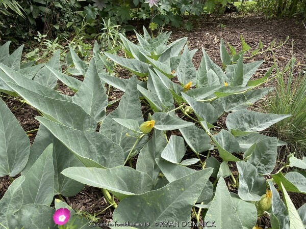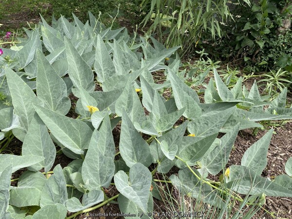 Buffalo Gourd (Cucurbita foetidissima) has large, gray-green, triangular leaves growing along long, prostrate stems. In the wild, the plants are often 20-30 feet across. Leaves are an attractive bluish green with a sandpapery texture. The large, bell-like flowers, 2-4 inches long, are yellow to orange, opening for only a day but blooming occurs over a month or so. The globular fruits, about 4 inches across, are green-striped when young, maturing to tennis-ball size and turning yellow. The plant supposedly gets the name "stink gourd" from its foul odor. Native to arid clay soils in Western Kansas, Colorado, the southwestern United States, and northern Mexico, the plant forms a fleshy tap root which is used to store water and nutrients. A large 10' wide specimen has flourished in our display garden in Lawrence, KS for over 10 years. It is planted in full sun in clay soil with no extra irrigation. It survived -16 degrees F and a week of single digit highs in February, 2021. It would be very useful as a vine-like perennial cascading over the top of a retaining wall! Amazing that a perennial native to areas receiving 5-10" of rain per year can grow in a climate receiving 5-10 times more rain!