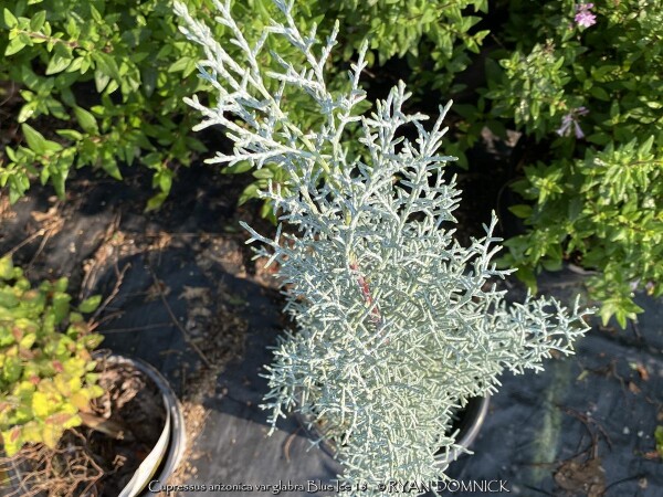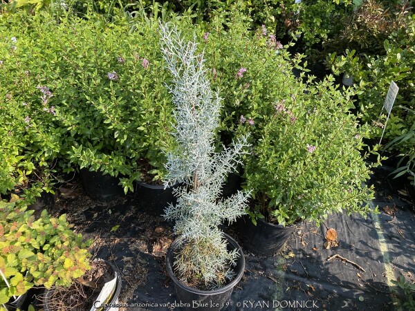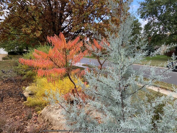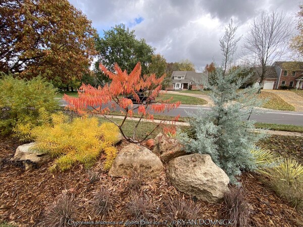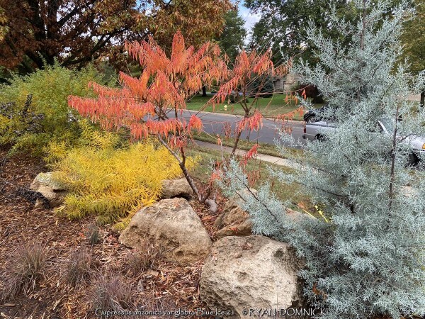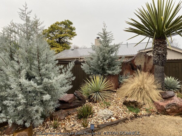Blue Ice Arizona Cypress (Cupressus arizonica var. glabra 'Blue Ice') is a relatively new plant being used in Kansas zone 6. Originally native to desert areas of the Southwest and Mexico including dry mountain slopes, it seems pretty well adapted to our climate without many of the traditional pests that plague evergreens. Several 15-20 foot tall specimens can be observed in the Wichita botanical garden, Botanica. 'Blue Ice' Arizona Cypress is grown for its bluish nearly silver foliage, unique conical (pyramidal when young) growth form, and occasional silver fruit. Drainage definitely needs to be on the positive side but most soils seem okay. Planting on a South or West foundation is perfect. (or on a south facing berm) Extreme heat tolerance is not a problem opposed to cold-loving blue spruce. Growth is relatively fast at about 1 to 2 feet per year; also much faster than traditional blue spruce. Small established plants on a berm in Lawrence, Kansas handled the deep freeze of 2021 surviving -16 degrees F and a week of single digit highs with no damage. Definitely a plant for the future!