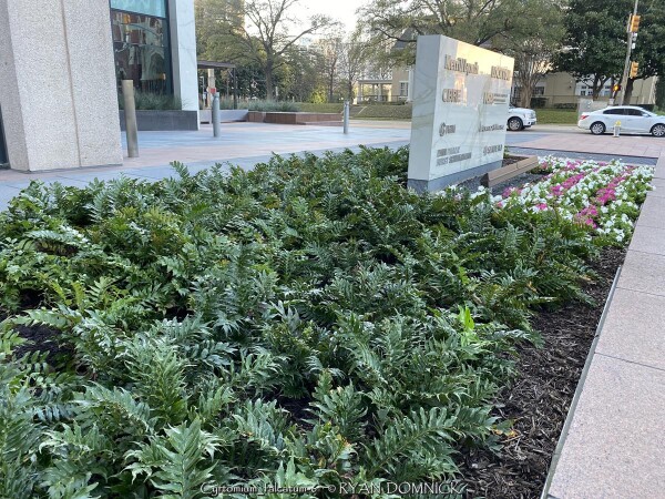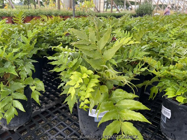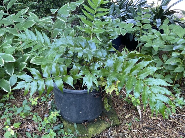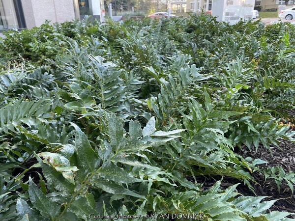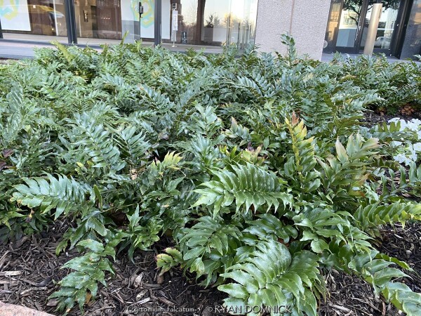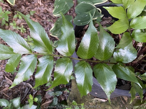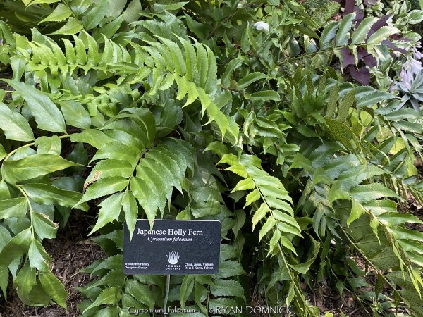 Japanese Holly Fern (Cyrtomium falcatum) is planted for its evergreen dark green foliage resemble holly branches. It is native to shaded mountain areas in forests, crevices in coastal cliffs, stream banks, rocky slopes, and other moist, stable areas in eastern Asia, India, southern Africa and even Hawaii. It is easily and quickly propagated by floating spores. It thrives in light shade to deep shade with average soil but does not tolerate poor drainage. If low temperatures hit -5 degrees F, the evergreen foliage finally dies back to the ground and re-emerges in early spring. If low temperatures hit -10 degrees F, it may kill an un-mulched plant; protect any zone 6 perennial with thick layer of mulch. Generally this plant can decline after a few years of Kansas climate but is worth a try in perfect soils in well-tended and protected shade gardens. Repeated or successive cold winters with complete foliage loss seem to be an issue with this and many evergreen zone 6/7 plants. One occasional difficult winter followed by mild winters is more tolerable. This is, however, one of the most deep shade tolerant plants available so may be worth a try. In a family member's zone 7a Stillwater OK garden, several specimens thrived for a over a decade until all were wiped out by a freak -19 degrees F cold event one winter. Amazingly, surviving spores survived to re-colonize parts of the garden.