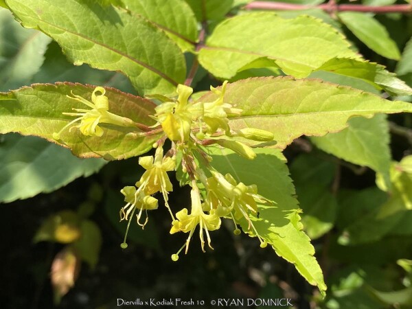 Looking for a durable native plant that will thrive in sun or shade, and is drought-tolerant? Deer-resistant, too? You've got it! This shrub (Diervilla x 'Kodiak Fresh') gives a new look to Diervilla with its bright lime-yellow foliage in summertime, always accompanied by bright yellow flowers. Like the other members of the Kodiak series, it lights up the fall landscape, making it an eco-friendly alternative to burning bush. A durable native plant that thrives in sun or shade, it is drought-tolerant, deer-resistant, and can even grow in dry shade. This is an excellent landscape plant that will succeed in even challenging sites. Top three reasons to grow Kodiak® Fresh diervilla: 1.Tolerant of dry shade (though color is best with at least some sun) 2.Never without yellow flower clusters in the summer. 3.Orangey-red new growth, persistent lime coloring, and glowing orange fall foliage. Uses Notes: Naturalizing; mass plantings. Maintenance Notes: Adaptable to most soils, including dry ones. Trim in spring and apply a controlled-release fertilizer. Though it is sometimes called "bush honeysuckle," Diervilla is not invasive like certain honeysuckles are. In Eastern Kansas, this cultivar performs WELL with just about everything nature has to challenge it! Heat and drought are tolerated if in shade or morning sun. Cold tolerance is no problem. No disease or pest problems. Great plant for dry-shade. Native to North America. All Proven Winners® plants are legally propagated, healthy and vigorous, true to name, and tagged with color pictures and growing information.