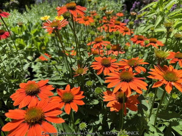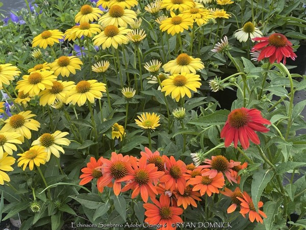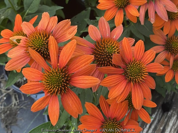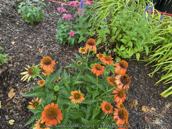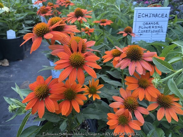 ***Description for this perennial available with future update!*** Echinacea 'Sombrero Adobe Orange' is also known as Sombrero Adobe Orange Coneflower >>>>>>>>>>>> Echinacea purpurea is an herbaceous perennial native to parts of eastern and midwestern United States most common in Missouri and Arkansas. Its habitats include dry open woods, prairies and barrens. Echinacea are native to North America, featuring sunflower-like flowers with a dark center and colorful petals. Colors on native plants include purple, magenta, white, yellow. Intensive breeding efforts to fish out recessive genes have brought bright orange and red into the picture. Flowers occur in early to mid summer often continuing into fall especially if dead-headed. Its individual flowers (florets) within the flower head are two-toned, having both male and female organs in each flower. (hermaphroditic) Bees and butterflies including the monarch are common pollinators. The dead flowers are attractive to some for winter interest but for those wanting a tidy your garden, they can be trimmed early. Leaving some dried seed heads will be beneficial for wildlife and provide winter food for finches and other birds. Best growth generally occurs in full to part sun with well drained soils with low to average moisture. In Eastern Kansas, typically our 40 inches of rainfall is sufficient without extra water. Coneflower can also handle short one to two day flooding events and are sometimes used along the higher perimeter of rain gardens to bring in pollinators. Coneflower mixes well with many other types of plants ranging from other native plants to evergreens to hardy tropicals. Rabbits can be a problem young immature plants. A popular method of control is covering the plant with an upside down bowl-shaped chicken wire cage for the first year to allow basil foliage to establish well. You can quickly make these yourself with a low cost roll of chicken wire. Mature plants especially in groups with other mature landscaping generally do not have rabbit problems. Flowers are also popular in the florist industry as cut flowers or in the cottage garden. The genus echinacea has undergone intense breeding with the introduction of hundreds of new cultivars in the last 10 years.