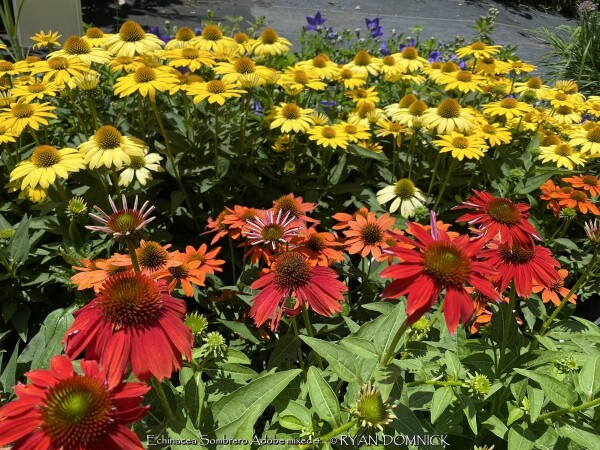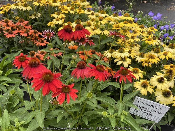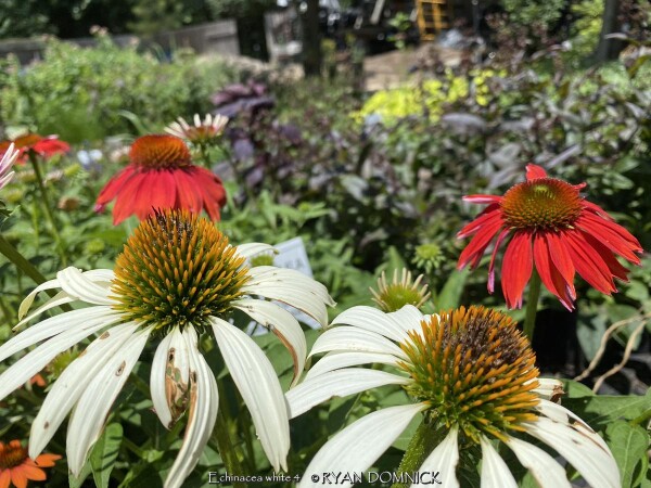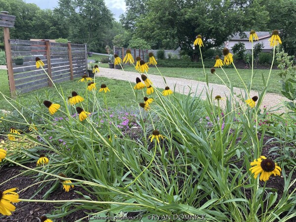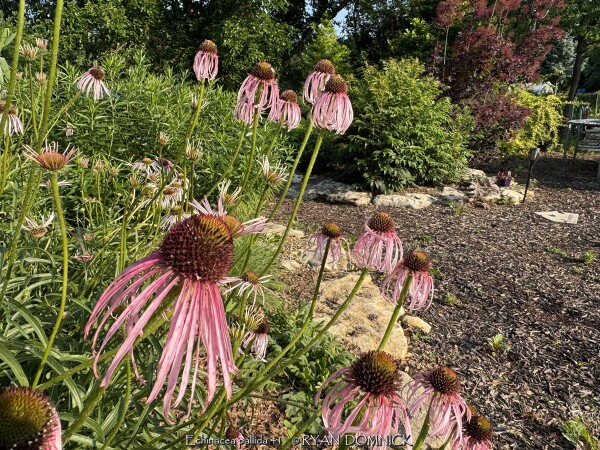 Echinacea purpurea is an herbaceous perennial native to parts of eastern and midwestern United States most common in Missouri and Arkansas. Its habitats include dry open woods, prairies and barrens. Echinacea are native to North America, featuring sunflower-like flowers with a dark center and colorful petals. Colors on native plants include purple, magenta, white, yellow. Intensive breeding efforts to fish out recessive genes have brought bright orange and red into the picture. Flowers occur in early to mid summer often continuing into fall especially if dead-headed. Its individual flowers (florets) within the flower head are two-toned, having both male and female organs in each flower. (hermaphroditic) Bees and butterflies including the monarch are common pollinators. The dead flowers are attractive to some for winter interest but for those wanting a tidy your garden, they can be trimmed early. Leaving some dried seed heads will be beneficial for wildlife and provide winter food for finches and other birds. Best growth generally occurs in full to part sun with well drained soils with low to average moisture. In Eastern Kansas, typically our 40 inches of rainfall is sufficient without extra water. Coneflower can also handle short one to two day flooding events and are sometimes used along the higher perimeter of rain gardens to bring in pollinators. Coneflower mixes well with many other types of plants ranging from other native plants to evergreens to hardy tropicals. Rabbits can be a problem young immature plants. A popular method of control is covering the plant with an upside down bowl-shaped chicken wire cage for the first year to allow basil foliage to establish well. You can quickly make these yourself with a low cost roll of chicken wire. Mature plants especially in groups with other mature landscaping generally do not have rabbit problems. Flowers are also popular in the florist industry as cut flowers or in the cottage garden. The genus echinacea has undergone intense breeding with the introduction of hundreds of new cultivars in the last 10 years. This entry included mixed species and cultivars.