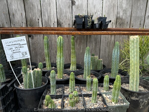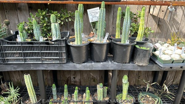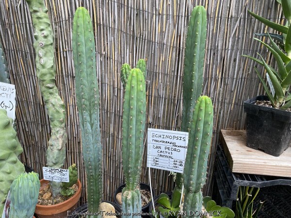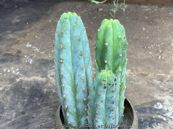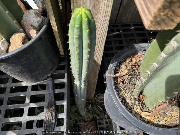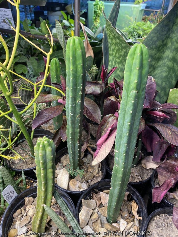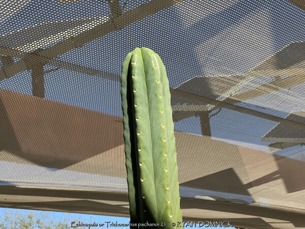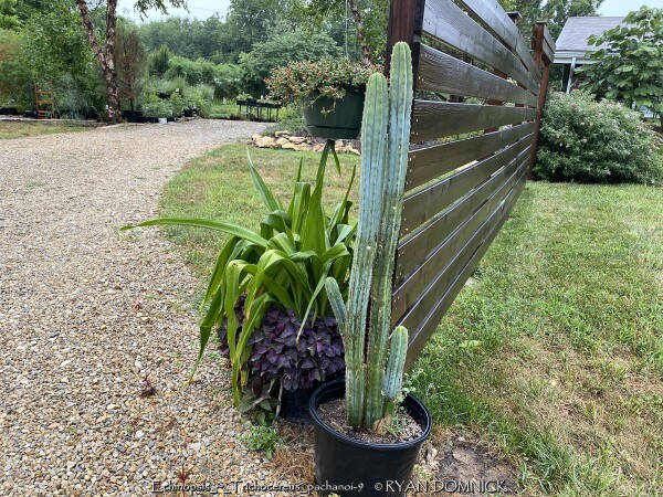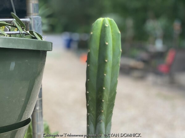 Grown for its beautiful bluish-green skin and relatively few spines, San Pedro Cactus (Echinopsis / Trichocereus pachanoi) is usually a patio or house plant in Kansas. Because it grows naturally in the Peruvian Andes Mountains at high altitude and with high rainfall, it can withstand temperatures far below that of many other cacti. In the wild, this species is hardy to 15-20 degrees F for short periods of time. Grow in full sun with optional extra watering including that which comes from rainfall. Repotting may or may not be needed depending on how large you want the plant to grow; plants can continue to grow taller and tolerate extremely root-bound pots but may need wind bracing. If repotting, make sure to use a sharp draining medium organic cactus mix with plenty of sand and perlite. To play is safe, potted plants are best moved in before night temperatures get below 45 degrees F. It is important to avoid the combination of wet and cold. Before extreme cold occurs, move to a bright interior window over the winter with no watering and keep above freezing. As a winter house plant, it will look presentable all winter long with just no waterings.(also to prevent lanky winter growth) As a permanent house plant, provide bright light and allow the soil to dry between waterings for many years of carefree enjoyment. Plants grown permanently indoors may begin to elongate stretching for light producing weak new growth. It can be hard to reproduce the intense UV sunlight they need so moving outside for the summer is best. Generally if moving outside for the summer, allow 1-2 weeks of part shade or morning sun before placing in full sun. Plants with time to acclimate will thrive in full sun but be careful not to rush it or sunburning will occur. Potted plants are very low maintenance. I have never seen any insect problems on this plant. The San Pedro cactus contains a number of alkaloids, including the well-studied chemical mescaline. In the US, it is currently legal to cultivate the San Pedro cactus for gardening and ornamental purposes, but not for consumption.
