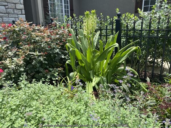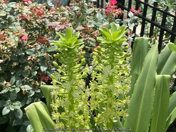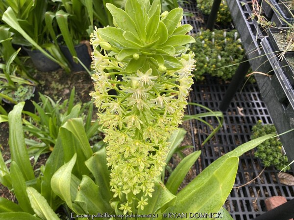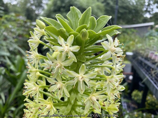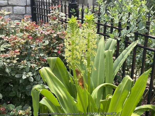 Giant Pineapple Lily (Eucomis pallidiflora ssp. pole-evansii) are typically grown for their wide tropical foliage and giant pineapple-like flowers. Everything about this pineapple lily is large! Bright green foliage upto 3 feet tall contrasts well with many other flower colors. The plants are temperate and subtropical herbaceous perennial bulbs native to areas with a summer wet season and dry winter. Pineapple Lily are hardy outside as a perennial when established and with minimal effort at least up to zone 6a. During the growing season, fertilize, water regularly, and plant in full sun. Plant these bulbs in the ground at least 8-12" deep with 3-4" of mulch to enjoy a wonderful tropical effect! Foliage may look bedwraggled by fall so it is ok to cut back foliage at that time. They can also be grown as a flowering summer patio plant. If growing as a potted plant and trying to overwinter, allowing the foliage to frost is ok, it will not kill the root system. However, do not allow the pot with rootball to freeze solid or go below 20 degrees for more than a few hours; move into a cold garage or basement over the winter with no watering. Cut back and allow to go dormant and place entire pot back out in April or May with a time-release fertilizer. Another more labor intensive way to overwinter pineapple lily is to remove them from the dirt, dust with fungicide, place in box with sawdust, and keep in the refrigerator. We consider this method old-fashioned and too much work but ok if you only want to save a few bulbs. If digging from the ground in colder zones, just save a big chunk with the dirt intact and place into a large pot in the garage. In our display garden in Lawrence, KS (zone 6a), an established specimen planted over 4-6" deep and mulched 2-3" with wood mulch survived -17 degrees F. During the arctic blast of February, 2021, lows down to -17 degrees F on Feb 16th, 2021 were recorded. The longevity of this cold blast was also impressive: 10 days on a row with highs of 10-15 degrees F or lower, 8 nights of lows in the single digits and negatives, and 36 straight hours of 0 degrees F and mostly lower. This eucomis has survived for over 3 years now.