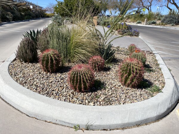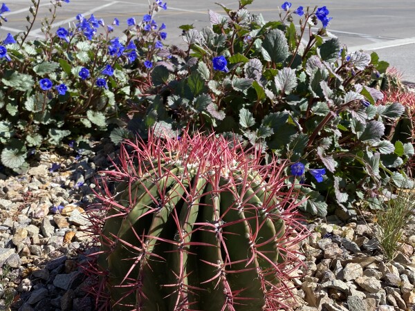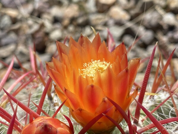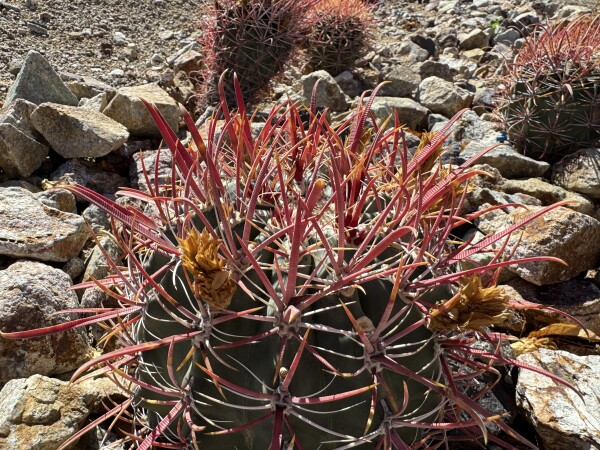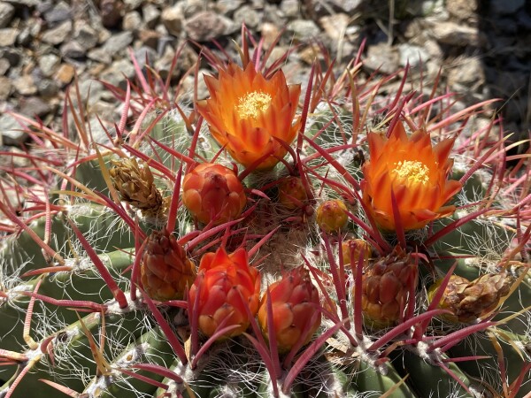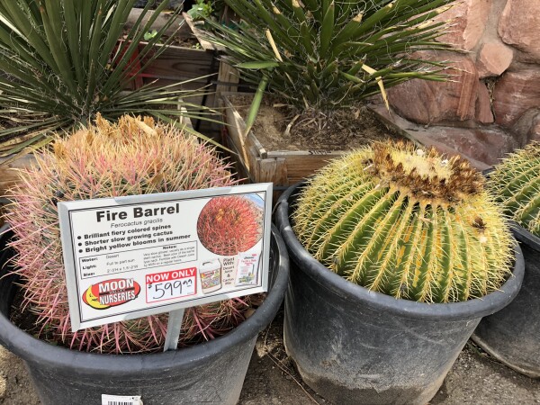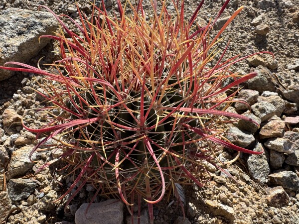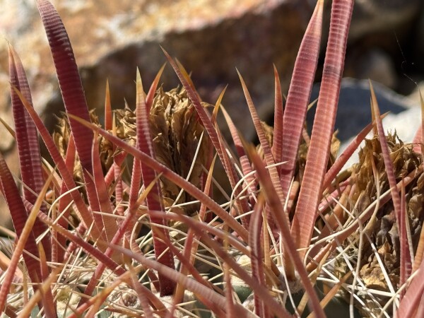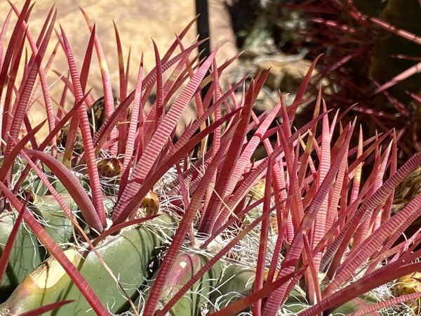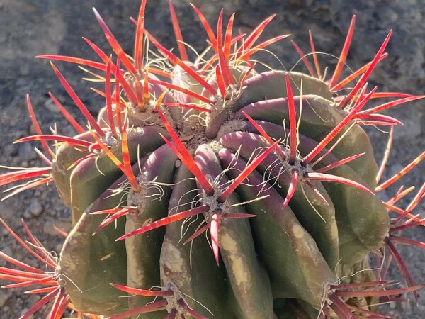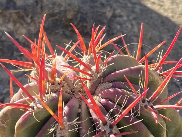 Fire Barrel Cacti (Ferocactus sp.) are known for their bright red spines. Native to the Mojave desert south to the desert of Baja California, it's usually grown as a patio or house plant in Kansas. In the wild, some fire barrel species are hardy to 20 degrees F. Grow in full sun with no extra watering except that which comes from rainfall. Repotting may or may not be needed depending on how large you want the plant to grow; plants can continue to grow taller and tolerate extremely root-bound pots but may need wind bracing. If repotting, make sure to use a sharp draining low organic cactus mix with plenty of sand and perlite. Potted plants are hardy to at least 25 degrees F for a short time if kept dry so you are ok if you miss the first light frost. Do not allow the pot with rootball to freeze solid though. Before extreme cold occurs, move to a bright interior window over the winter with no watering and keep above freezing. As a winter house plant, it will look presentable all winter long with just no waterings.(also to prevent lanky winter growth) As a permanent house plant, provide bright light and allow the soil to dry between waterings for many years of carefree enjoyment. Plants grown permanently indoors may begin to elongate stretching for light and lose their spine color. It can be hard to reproduce the intense UV sunlight they need so moving outside for the summer is best. Generally if moving outside for the summer, allow 1-2 weeks of part shade or morning sun before placing in full sun. Plants with time to acclimate will thrive in full sun but be careful not to rush it or sunburning will occur. Potted plants are very low maintenance but watch for scale and mealybugs that may hide beneath the cover of spines.