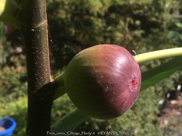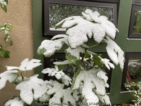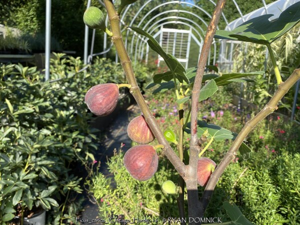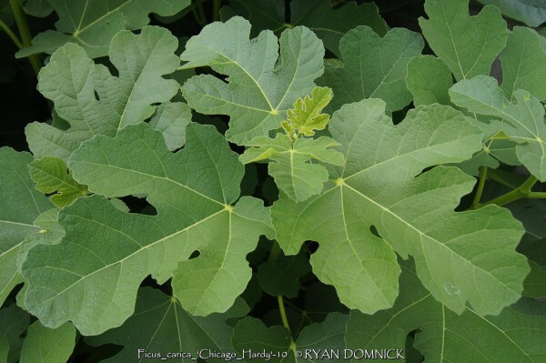 The common fig (Ficus carica) is native to an area extending from Asiatic Turkey to northern India. In Kansas, plant in a protected area near the house on south or west side but will survive in other locations in full hot sun. As an edible, ornamental plant, figs are an attractive bush-like plant with sandpapery green sometimes deeply lobed leaves. There is a slight and pleasant aroma when brushing against the foliage. Fruits are dark purple to maroon. Figs love full hot sun and are very drought tolerant but will produce more fruit if watered during the summer. Expect fig tree to die to the ground each year and start growing in May a bit later than other plants. Regrowth is rapid and established figs will have dozens of 5-6' water sprouts loaded with a few hundred fruits by September. You will always get a late summer/fall crop because fruit can come from new wood. If growing as a potted patio plant, grow in full sun with plenty of water during the summer. Then in late fall before temperatures get below 20 degrees F, move into a cold garage or basement over the winter with minimal watering. Do not allow the pot with rootball to freeze solid or go below 15 degrees for more than a few hours. By March or April, the fig will be trying to grow and you may put back outside (protect from late frosts) and you will also have a spring fruit crop. Eat fresh, freeze for fruit smoothies, or dry in sun or food dehydrator. In our trial gardens in Lawrence, KS (zone 6a), several established specimens planted 5-10 years ago and mulched 1-3" with wood mulch survived -17 degrees F. During the arctic blast of February, 2021, lows down to -17 degrees F on Feb 16th, 2021 were recorded. The longevity of this cold blast was also impressive: 10 days on a row with highs of 10-15 degrees F or lower, 8 nights of lows in the single digits and negatives, and 36 straight hours of 0 degrees F and mostly lower. 'Chicago Hardy' is considered to be one of the hardiest edible figs producing reliable fruits. It's stems are hardy to 10°F and the roots are hardy to -20°F. Sometimes if prolonged September cold-fronts occur and temperatures are too low at night, green fruits will disappointingly stop ripening. Look for a hot planting location microclimate such as a West or South wall to encourage fruit to ripen. Ripening does not continue to progress if harvested early (when fruit has any green coloring present).