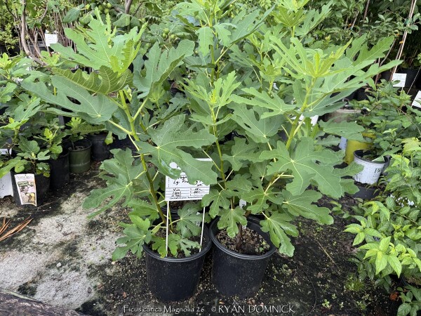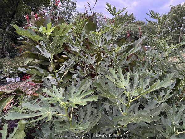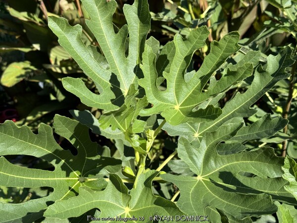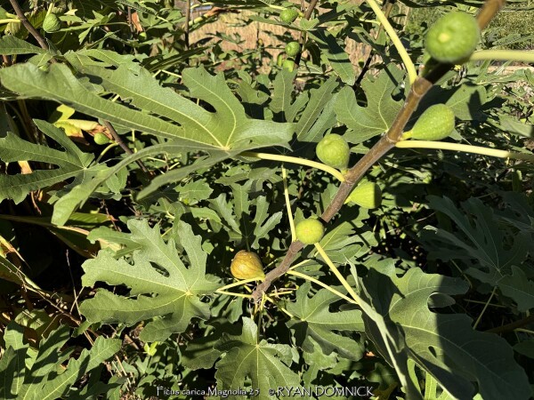 The common fig (Ficus carica) is native to an area extending from Asiatic Turkey to northern India. In Kansas, plant in a protected area near the house on south or west side but will survive in other locations in full hot sun. As an edible, ornamental plant, figs are an attractive bush-like plant with sandpapery green sometimes deeply lobed leaves. There is a slight and pleasant aroma when brushing against the foliage. Fruits are dark purple to maroon. Figs love full hot sun and are very drought tolerant but will produce more fruit if watered during the summer. Expect fig tree to die to the ground each year and start growing in May a bit later than other plants. Regrowth is rapid and established figs will have dozens of 5-6' water sprouts loaded with a few hundred fruits by September. You will always get a late summer/fall crop because fruit can come from new wood. If growing as a potted patio plant, grow in full sun with plenty of water during the summer. Then in late fall before temperatures get below 20 degrees F, move into a cold garage or basement over the winter with minimal watering. Do not allow the pot with rootball to freeze solid or go below 15 degrees for more than a few hours. By March or April, the fig will be trying to grow and you may put back outside (protect from late frosts) and you will also have a spring fruit crop. Eat fresh, freeze for fruit smoothies, or dry in sun or food dehydrator. In our trial gardens in Lawrence, KS (zone 6a), three specimens planted in 2020 and mulched 1-3" with wood mulch. Surprisingly, they survived -17 degrees F. During that arctic blast of February, 2021, lows down to -17 degrees F on Feb 16th, 2021 were recorded. The longevity of this cold blast was also impressive: 10 days on a row with highs of 10-15 degrees F or lower, 8 nights of lows in the single digits and negatives, and 36 straight hours of 0 degrees F and mostly lower. Magnolia Large Fruiting Fig (Ficus carica 'Magnolia') has slightly larger more deeply lobed foliage that is more ornamental. The fruit is large with brown skin and amber pulp. Pick the fruit just before maturity for a perfect flavor and to avoid souring and splitting. Sometimes if prolonged September cold-fronts occur and temperatures are too low at night, green fruits will disappointingly stop ripening. Look for a hot planting location microclimate such as a West or South wall to encourage fruit to ripen. Ripening does not continue to progress if harvested early (when fruit has any green coloring present).