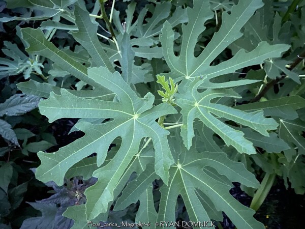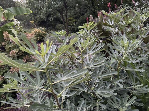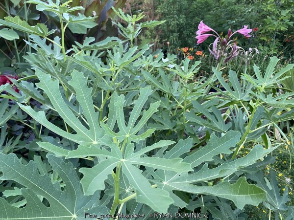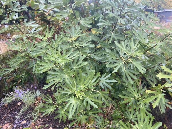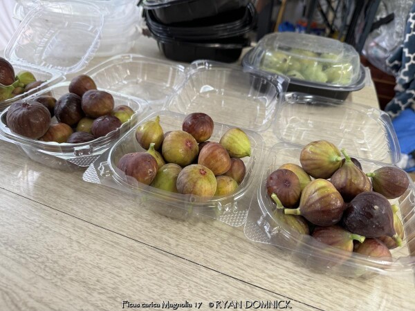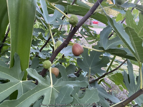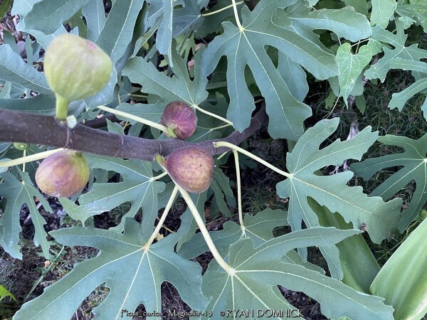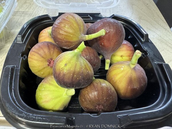 The common fig (Ficus carica) is native to an area extending from Asiatic Turkey to northern India. In Kansas, plant in a protected area near the house on south or west side but will survive in other locations in full hot sun. As an edible, ornamental plant, figs are an attractive bush-like plant with sandpapery green sometimes deeply lobed leaves. There is a slight and pleasant aroma when brushing against the foliage. Fruits are dark purple to maroon. Figs love full hot sun and are very drought tolerant but will produce more fruit if watered during the summer. Expect fig tree to die to the ground each year and start growing in May a bit later than other plants. Regrowth is rapid and established figs will have dozens of 5-6' water sprouts loaded with a few hundred fruits by September. You will always get a late summer/fall crop because fruit can come from new wood. If growing as a potted patio plant, grow in full sun with plenty of water during the summer. Then in late fall before temperatures get below 20 degrees F, move into a cold garage or basement over the winter with minimal watering. Do not allow the pot with rootball to freeze solid or go below 15 degrees for more than a few hours. By March or April, the fig will be trying to grow and you may put back outside (protect from late frosts) and you will also have a spring fruit crop. Eat fresh, freeze for fruit smoothies, or dry in sun or food dehydrator. In our trial gardens in Lawrence, KS (zone 6a), three specimens planted in 2020 and mulched 1-3" with wood mulch. Surprisingly, they survived -17 degrees F. During that arctic blast of February, 2021, lows down to -17 degrees F on Feb 16th, 2021 were recorded. The longevity of this cold blast was also impressive: 10 days on a row with highs of 10-15 degrees F or lower, 8 nights of lows in the single digits and negatives, and 36 straight hours of 0 degrees F and mostly lower. Magnolia Large Fruiting Fig (Ficus carica 'Magnolia') has slightly larger more deeply lobed foliage that is more ornamental. The fruit is large with brown skin and amber pulp. Pick the fruit just before maturity for a perfect flavor and to avoid souring and splitting. Sometimes if prolonged September cold-fronts occur and temperatures are too low at night, green fruits will disappointingly stop ripening. Look for a hot planting location microclimate such as a West or South wall to encourage fruit to ripen. Ripening does not continue to progress if harvested early (when fruit has any green coloring present).